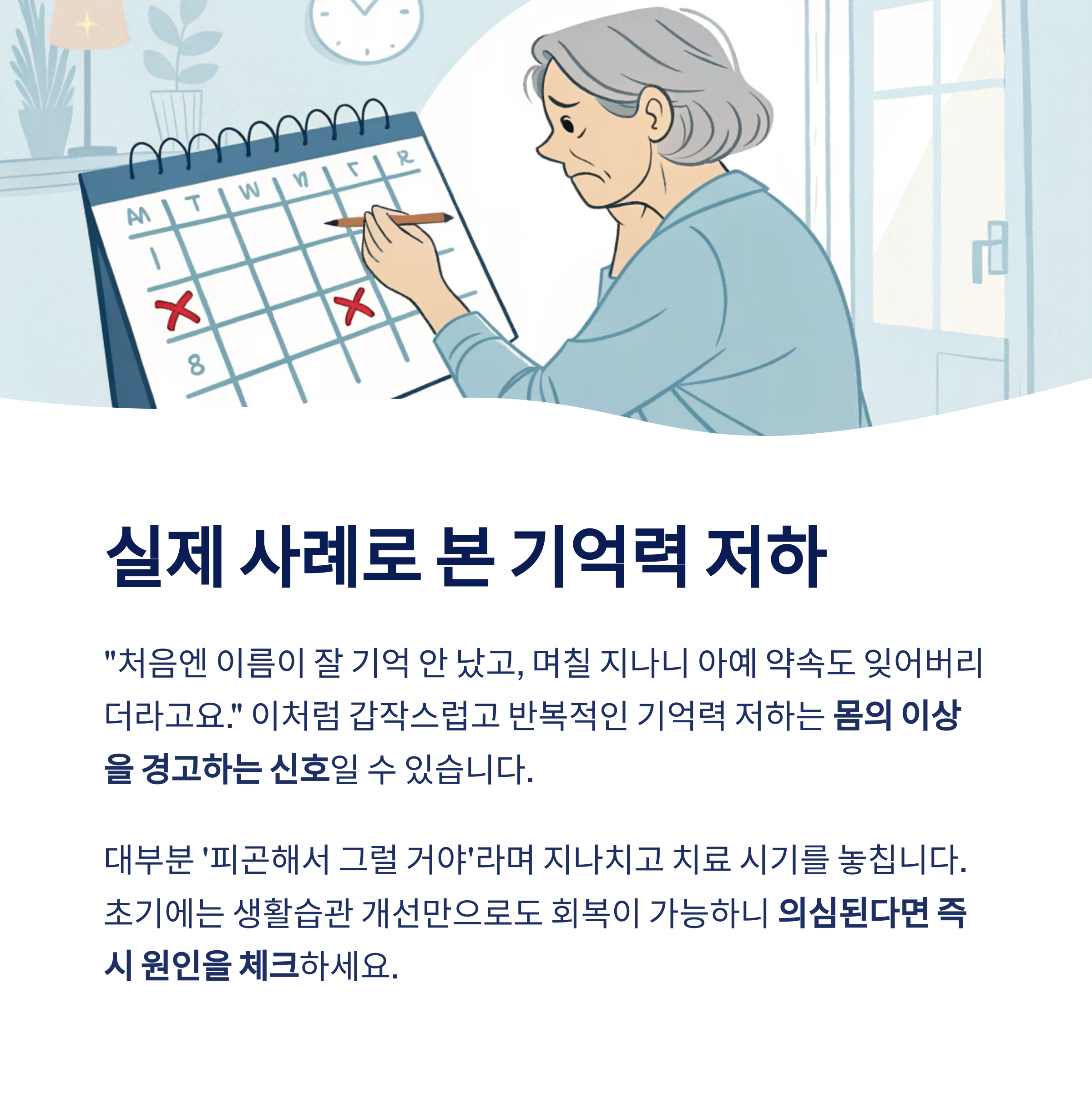 이처럼 갑작스럽고 반복적인 기억력 저하는 몸의 이상을 경고하는 신호일 수 있습니다.