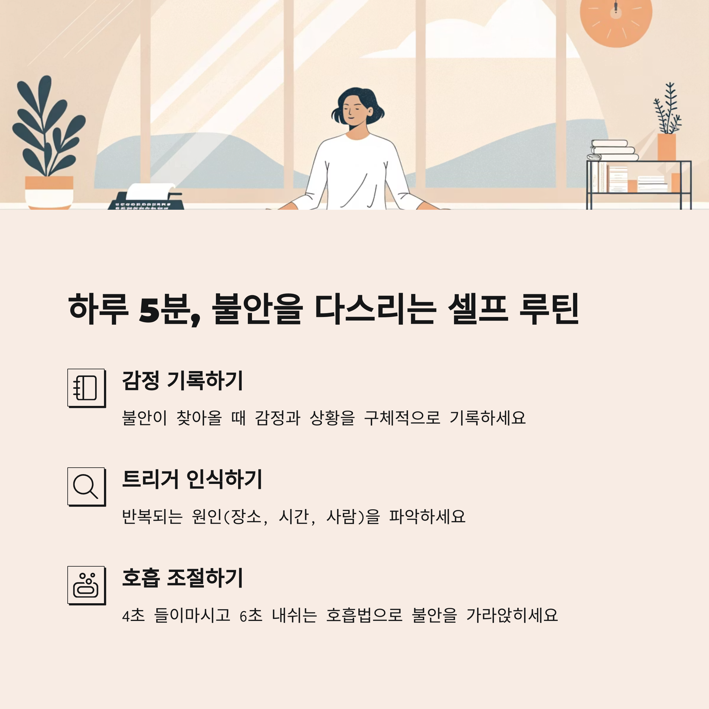 불안을 다스리는 나만의 루틴이나 추천하고 싶은 감정관리법이 있다면 댓글로 공유해주세요. 당신의 이야기가 또 다른 누군가에게 큰 도움이 됩니다.