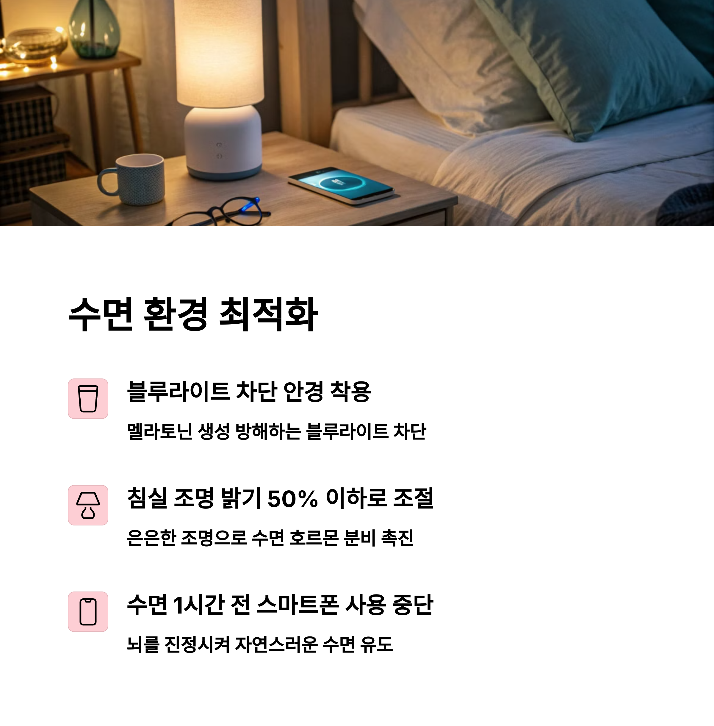 | 블루라이트 차단 안경도 효과적 | 간단한 요가 동작이나 복식 호흡 추천 | 차가운 조명보다 노란빛 조명 활용 |
