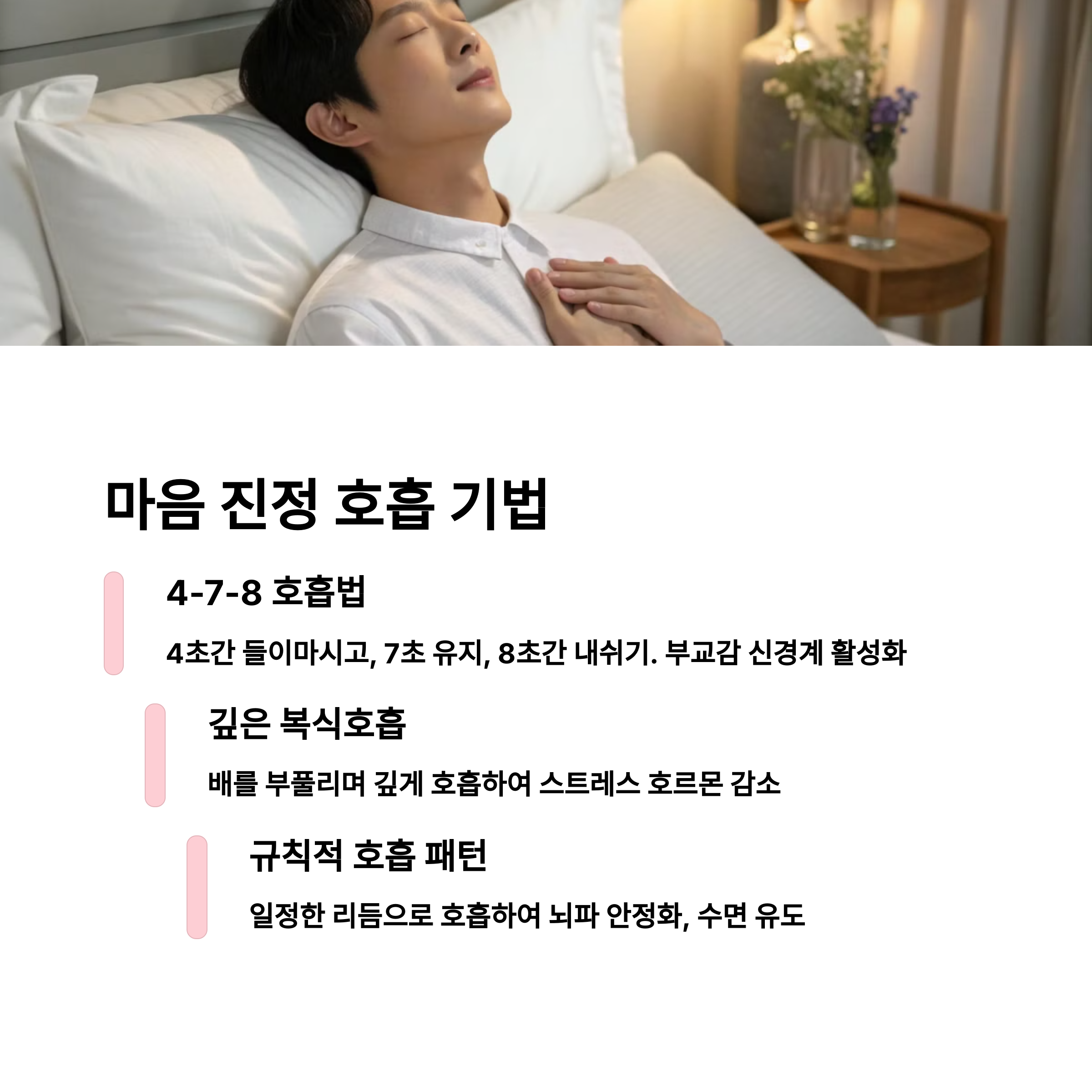| 스마트폰 사용 줄이고 눈의 피로 완화 | 근육 이완과 마음의 긴장을 풀어줌 | 어둡고 조용한 침실이 숙면에 효과적 |