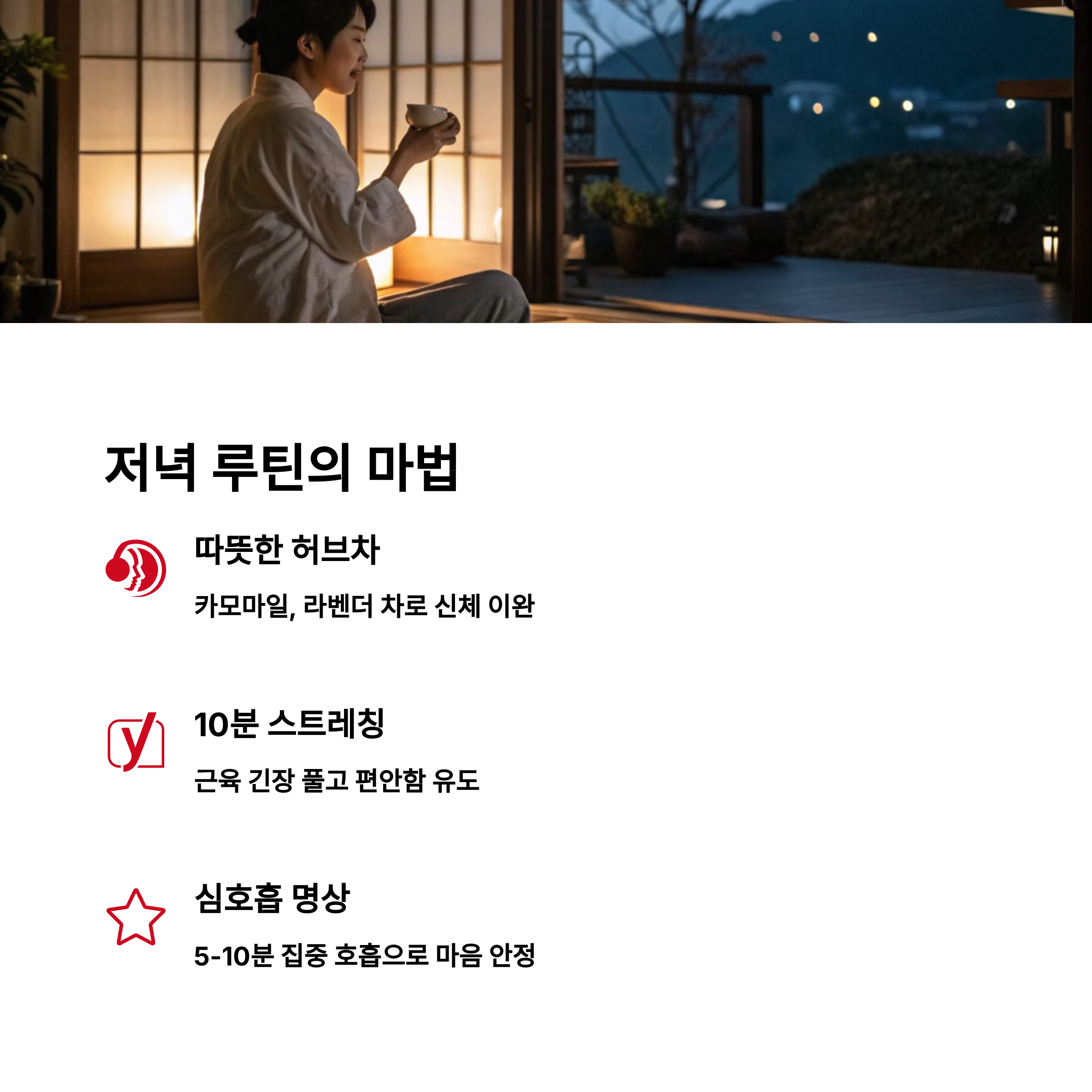 | 저녁 루틴 | 몸과 마음을 수면 모드로 전환해주는 습관입니다. |