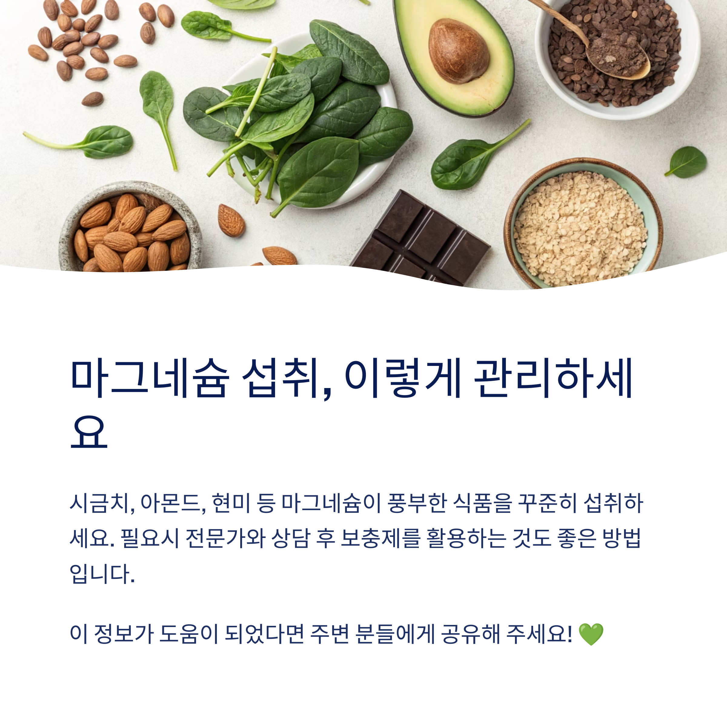 장기간 부족 시 심장·신경계 영향 가능 4개 이상 해당 시 전문 상담 권장 필요시 흡수율 높은 보충제 병행 섭취