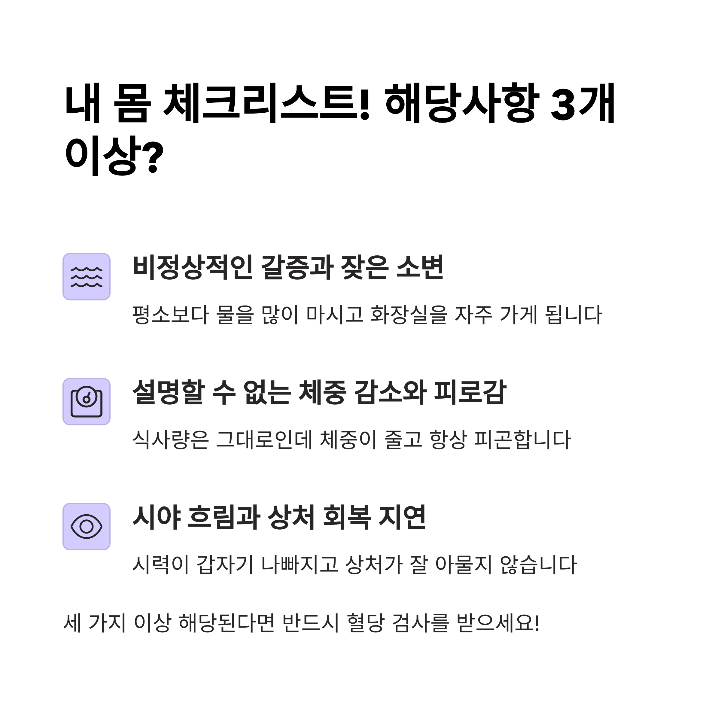 아래 자가 체크 항목 중 3개 이상 해당된다면 혈당 검사를 고려해보시기 바랍니다.