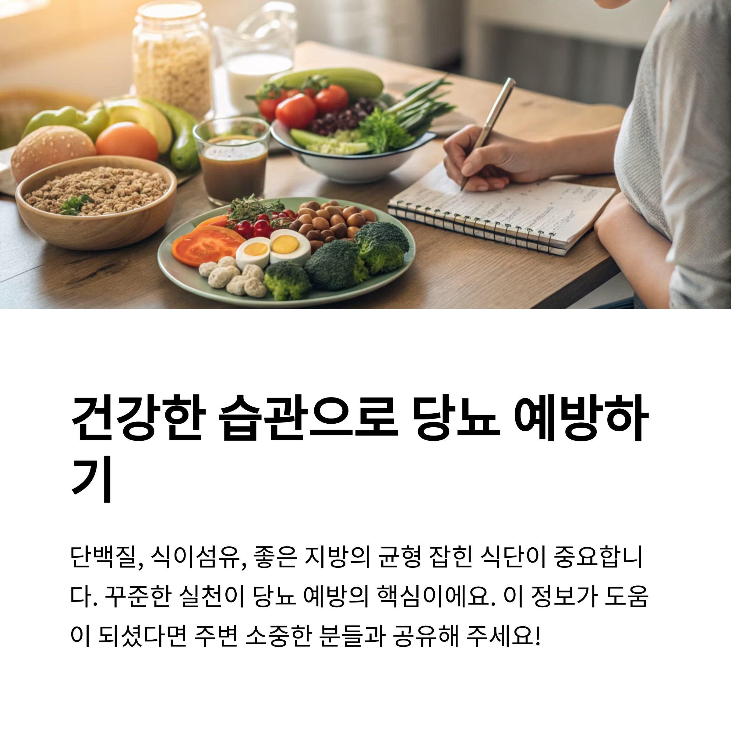 식단은 핵심적인 역할을 하지만, 규칙적인 운동, 체중 관리, 스트레스 조절과 함께 병행해야 더욱 효과적으로 당뇨를 예방할 수 있습니다.