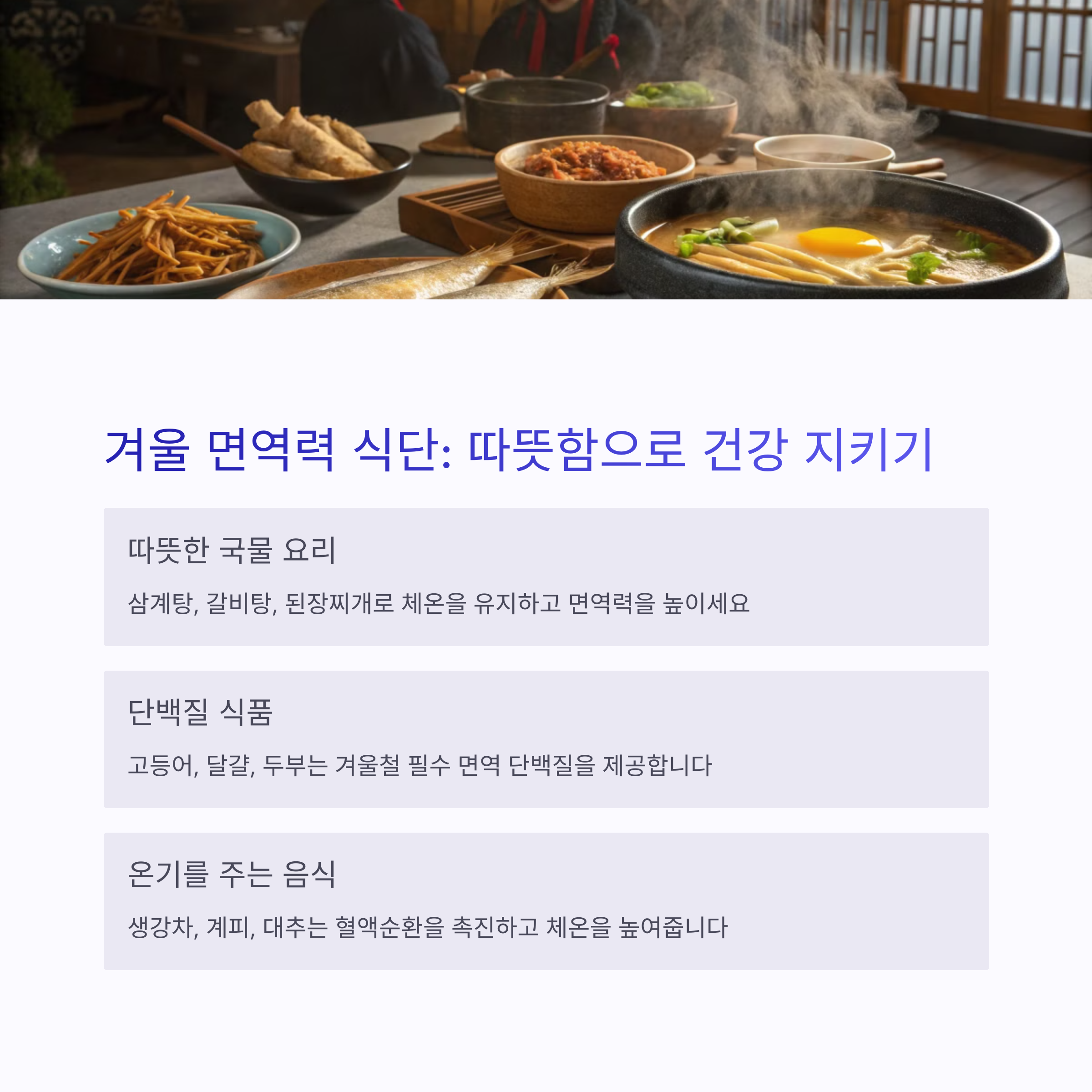 가을은 면역력이 떨어지기 쉬운 계절로, 폐와 기관지를 보호하는 배, 무, 도라지, 생강이 좋습니다. 따뜻한 음식으로 속을 데우고, 귤, 사과 같은 제철 과일로 비타민 보충을 하세요. 겨울에는 추위로 인해 신진대사가 느려지고 면역력이 약해질 수 있기 때문에, 단백질과 따뜻한 국물 음식을 중심으로 한 식사가 중요합니다. 닭고기, 미역국, 들깨탕, 표고버섯 등은 에너지를 보충해주고 면역 방어력을 높여줍니다.