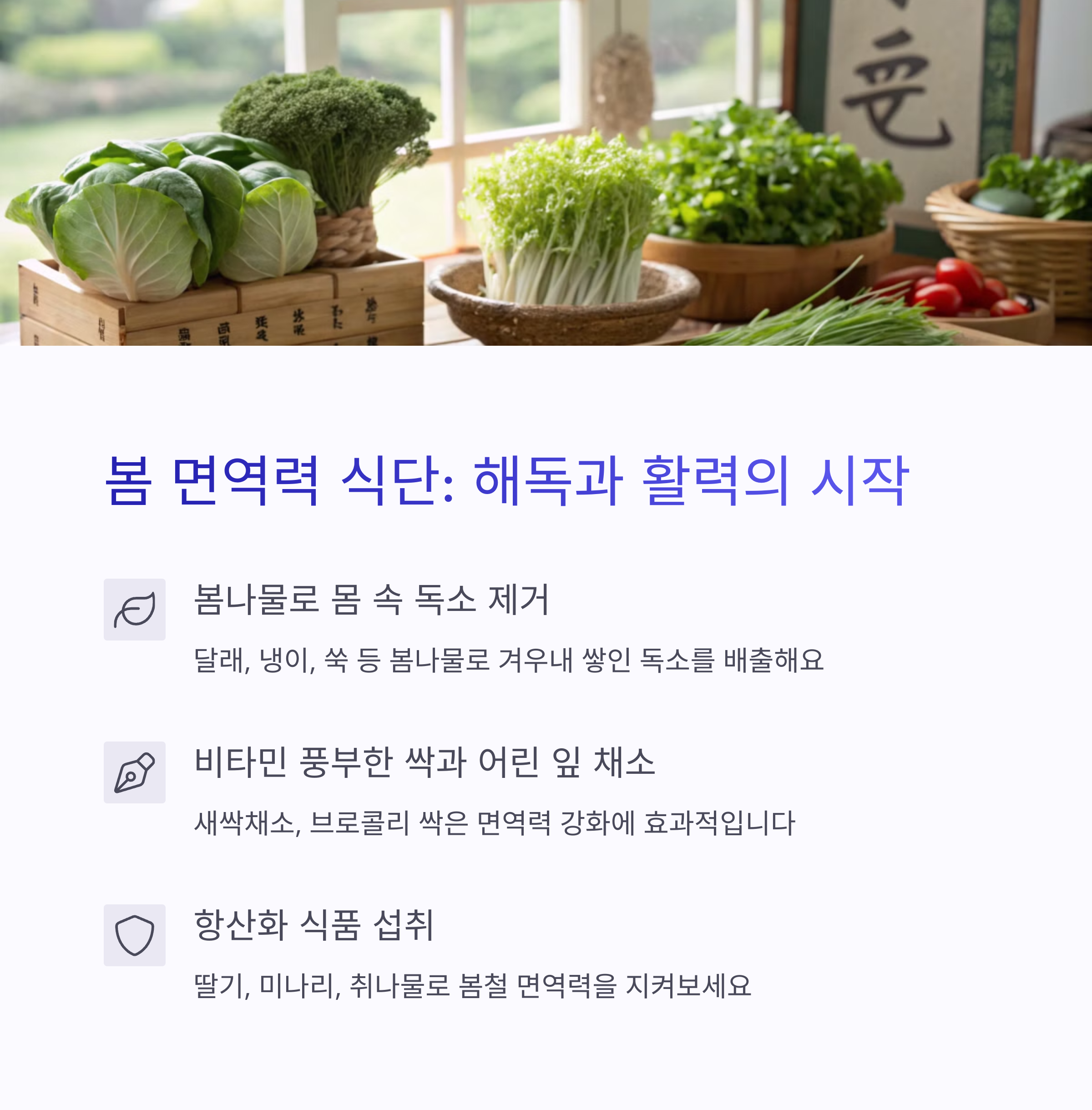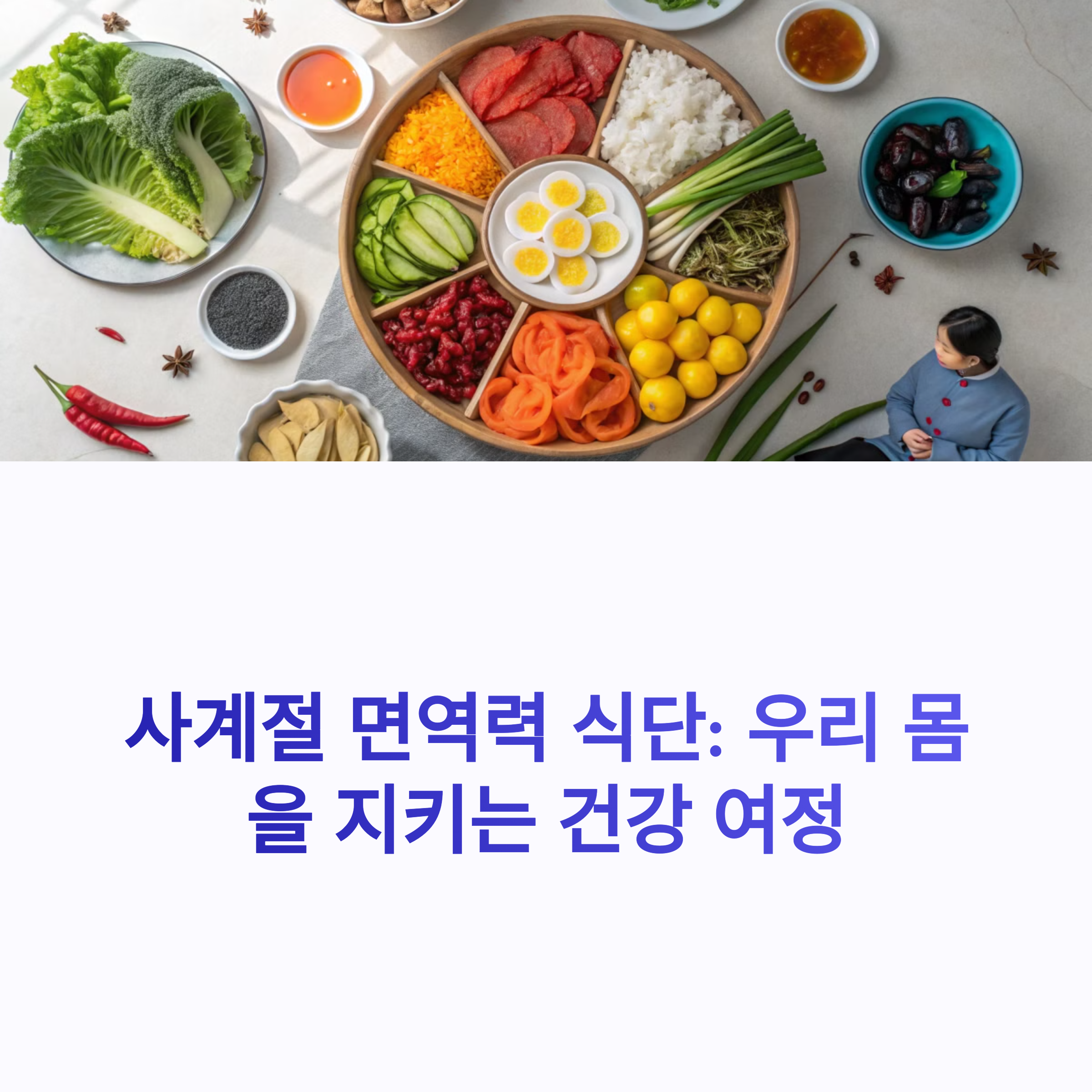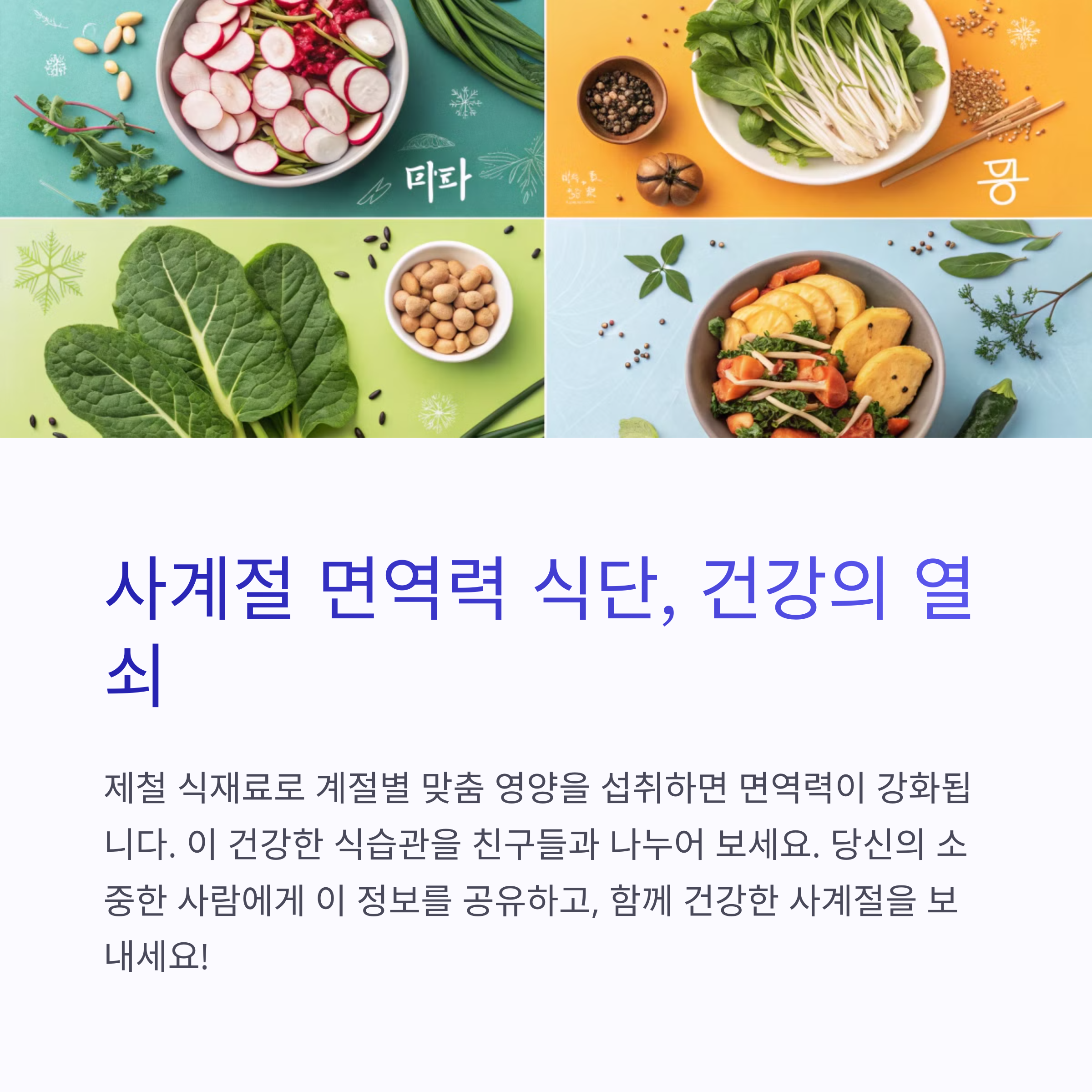 면역력은 하루아침에 완성되지 않습니다. 사계절 내내 우리 몸은 변화에 적응하고 있으며, 그에 맞는 식재료와 식단이 건강한 삶을 지키는 열쇠가 됩니다. 오늘부터 계절별 식단을 한 가지씩 실천해보세요. 자연이 주는 선물, 제철 식재료로 몸과 마음의 균형을 맞춘다면 어떤 바이러스도 두렵지 않을 거예요.