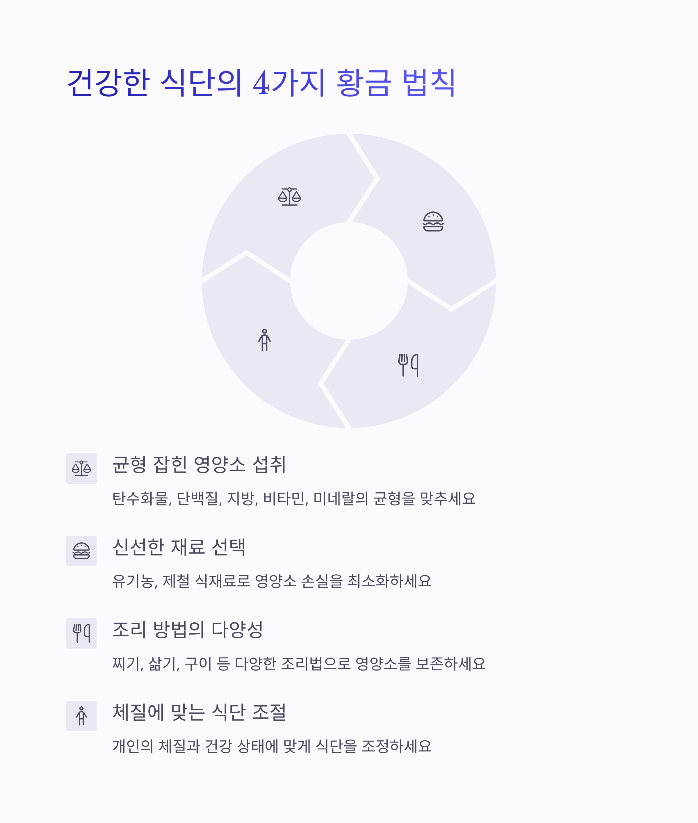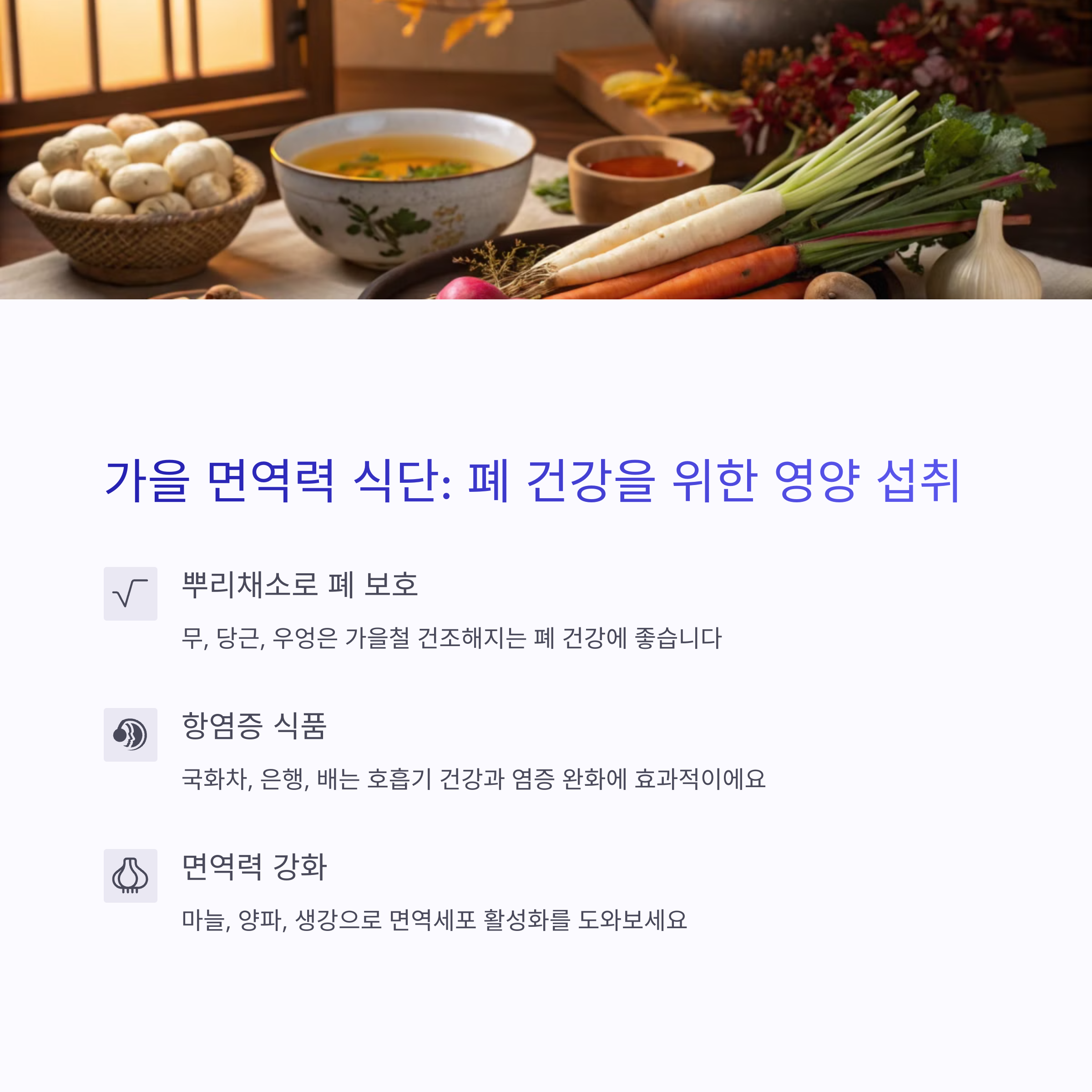 | 왜 식단이 중요할까? | 음식은 면역세포의 에너지와 재료를 공급하므로, 영양소 섭취가 곧 면역력 관리의 핵심입니다. |