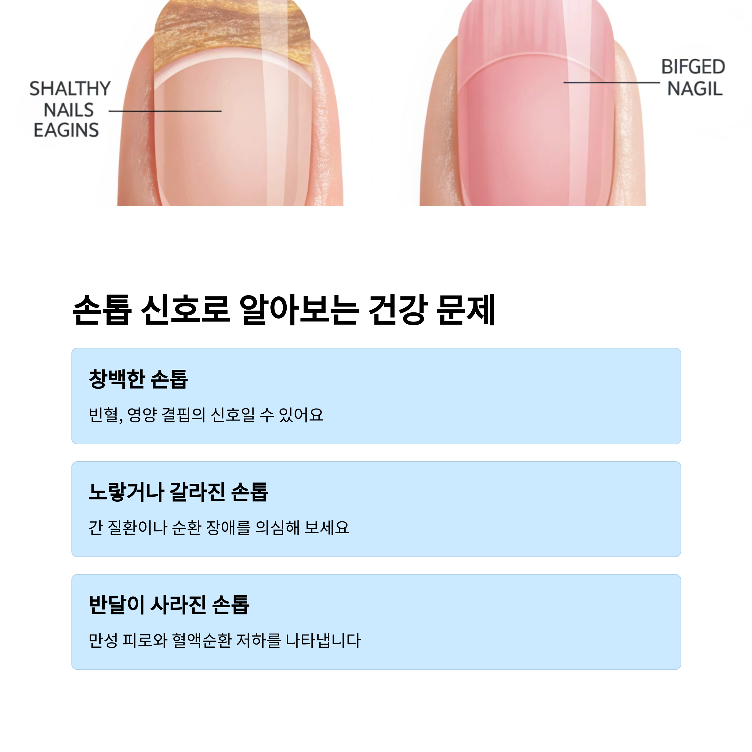 | 반달 없음, 갈라짐, 숟가락 모양, 줄무늬 | 빈혈, 갑상선, 간질환, 심장병 | 철분·단백질 섭취, 보습관리, 네일 휴식 |