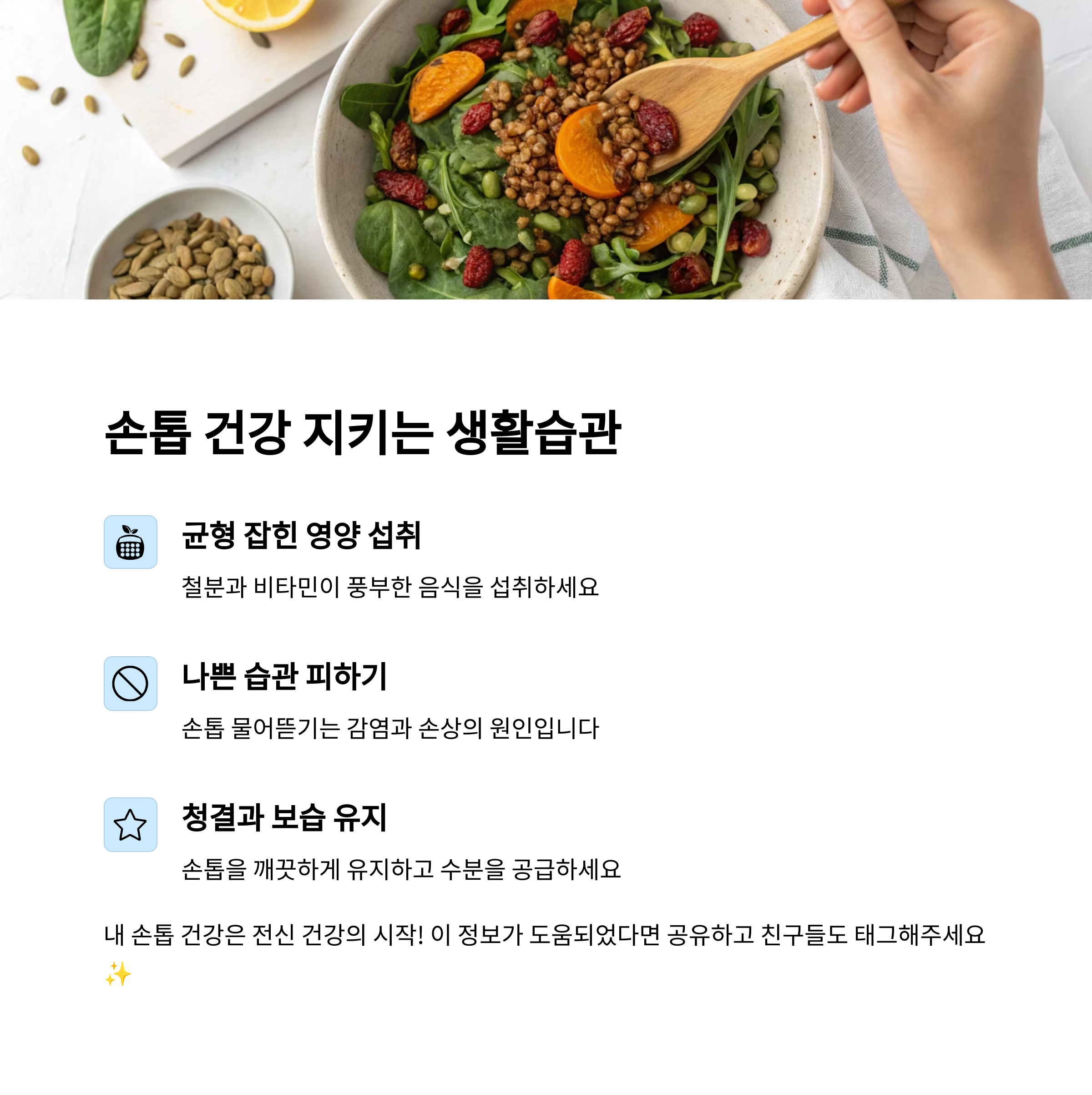 손톱 건강을 지키기 위해서는 균형 잡힌 영양 섭취가 가장 중요합니다. 단백질, 철분, 아연, 비타민 B군, C, E는 손톱 생성에 필수적인 영양소입니다. 또 손톱을 깨물거나 뜯는 습관은 손톱 손상뿐 아니라 감염 위험도 높이며, 젤 네일이나 화학 제품 사용도 장기적으로 손톱 건강에 해롭습니다. 손을 씻은 후 보습 크림이나 오일로 수분을 공급하고, 네일 사이클을 조절하여 손톱에 휴식을 주는 것도 손톱 건강 관리의 핵심입니다.