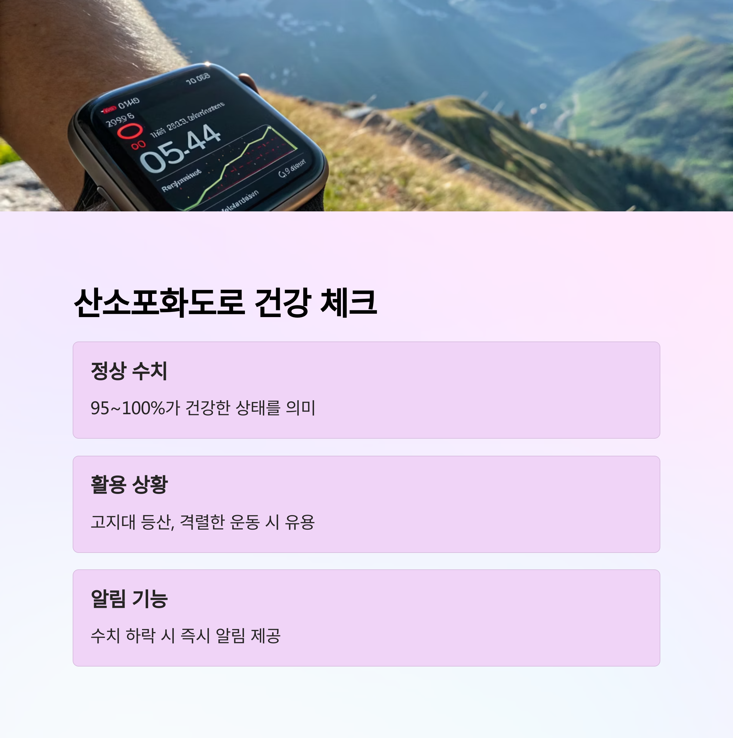 그 외에도 스마트워치는 혈중 산소 포화도 측정, 스트레스 지수 확인, 생리 주기 기록, 운동 중 칼로리 소모량 측정 등 다양한 기능을 지원합니다. 특히 혈중 산소 포화도는 호흡기 질환을 가진 분들이나 고지대 여행, 수면 무호흡증 등을 확인할 때 유용하며, 스트레스 지수는 명상 기능과 연계되어 심신 이완에 실질적인 도움을 줍니다. 이처럼 손목 위 작지만 강력한 기기로 건강을 체계적으로 관리할 수 있는 시대, 지금부터 활용해보시는 건 어떨까요?