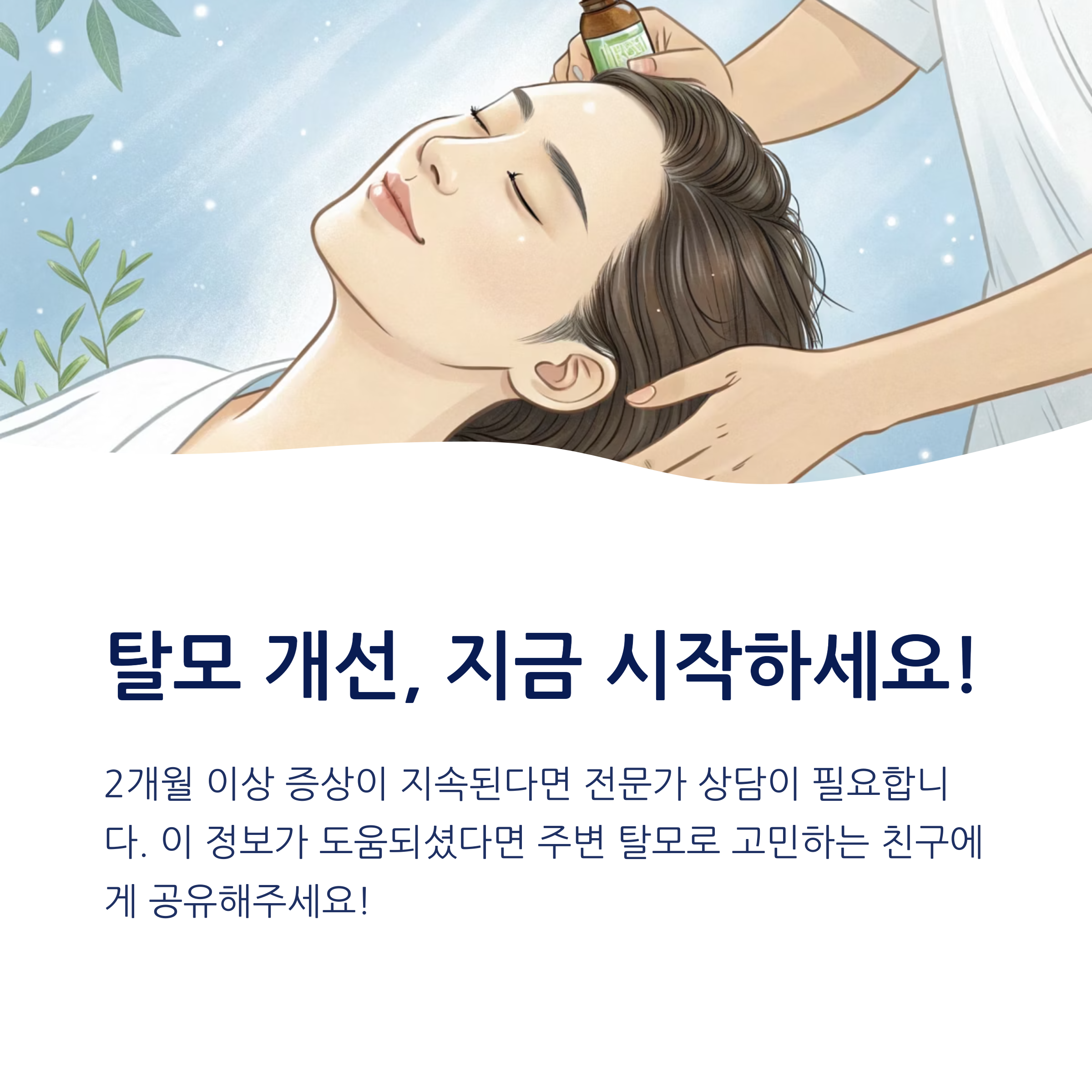 2개월 이상 탈모가 지속되거나, 두피 통증·염증이 동반된다면 피부과 전문 진료를 권장합니다.