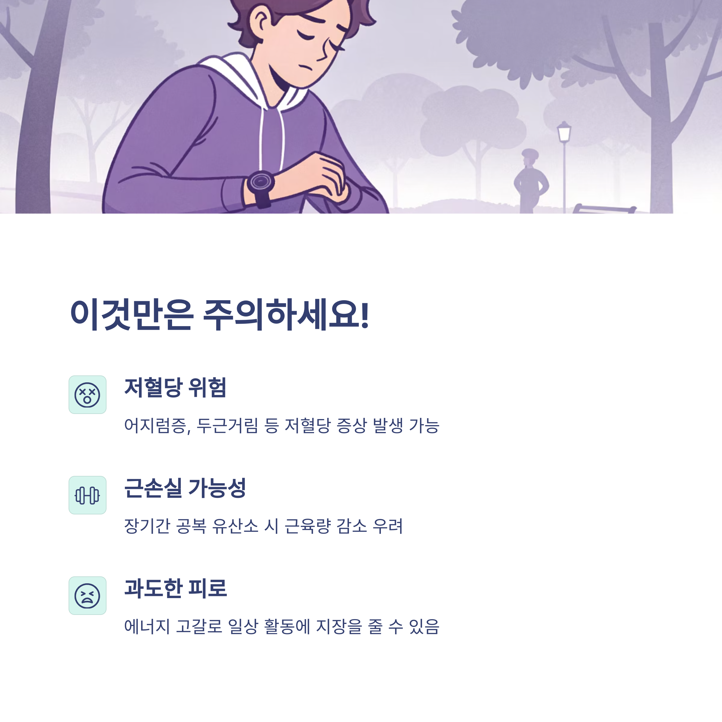 반면 단점도 존재합니다. 가장 주의해야 할 점은 저혈당으로 인한 어지러움이나 피로입니다. 공복 상태에서 에너지원이 부족하면 체내 단백질이 먼저 분해되어 근손실 위험이 발생할 수 있습니다. 또한 고강도 유산소 운동을 공복에 진행할 경우 심박수 상승으로 인해 부정맥이나 심장 부담을 초래할 수 있으며, 속이 메스껍거나 운동 집중력이 떨어지는 부작용도 경험할 수 있습니다. 특히 위장 질환이 있거나 만성질환자, 고령자라면 공복 운동은 오히려 위험할 수 있으므로 반드시 개인 건강 상태를 고려해 신중히 접근해야 합니다.