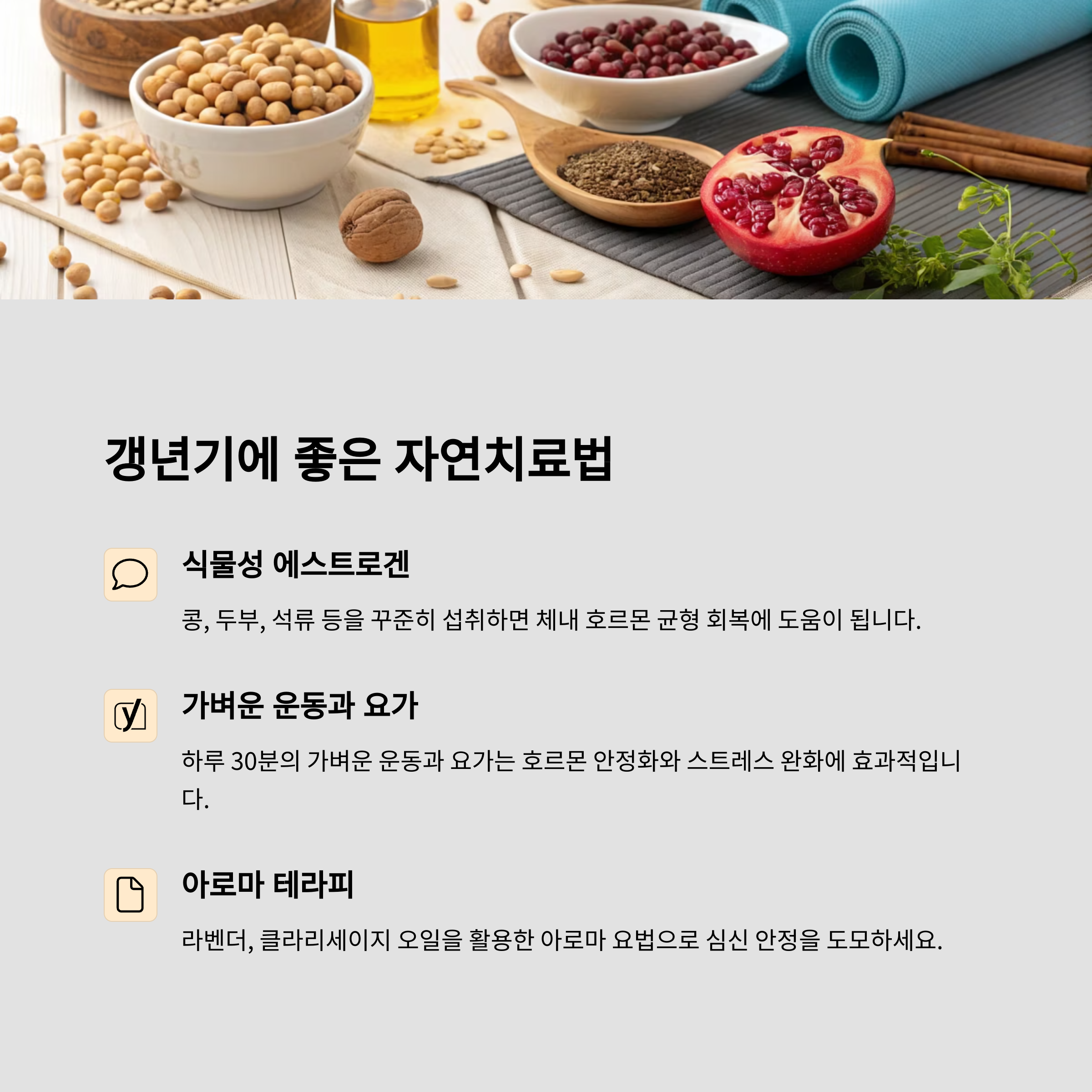콩, 석류, 아마씨, 두부 등 자연식품에 풍부 명상, 요가, 복식호흡으로 자율신경 조절 허브요법, 아로마테라피, 족욕, 햇볕 쬐기