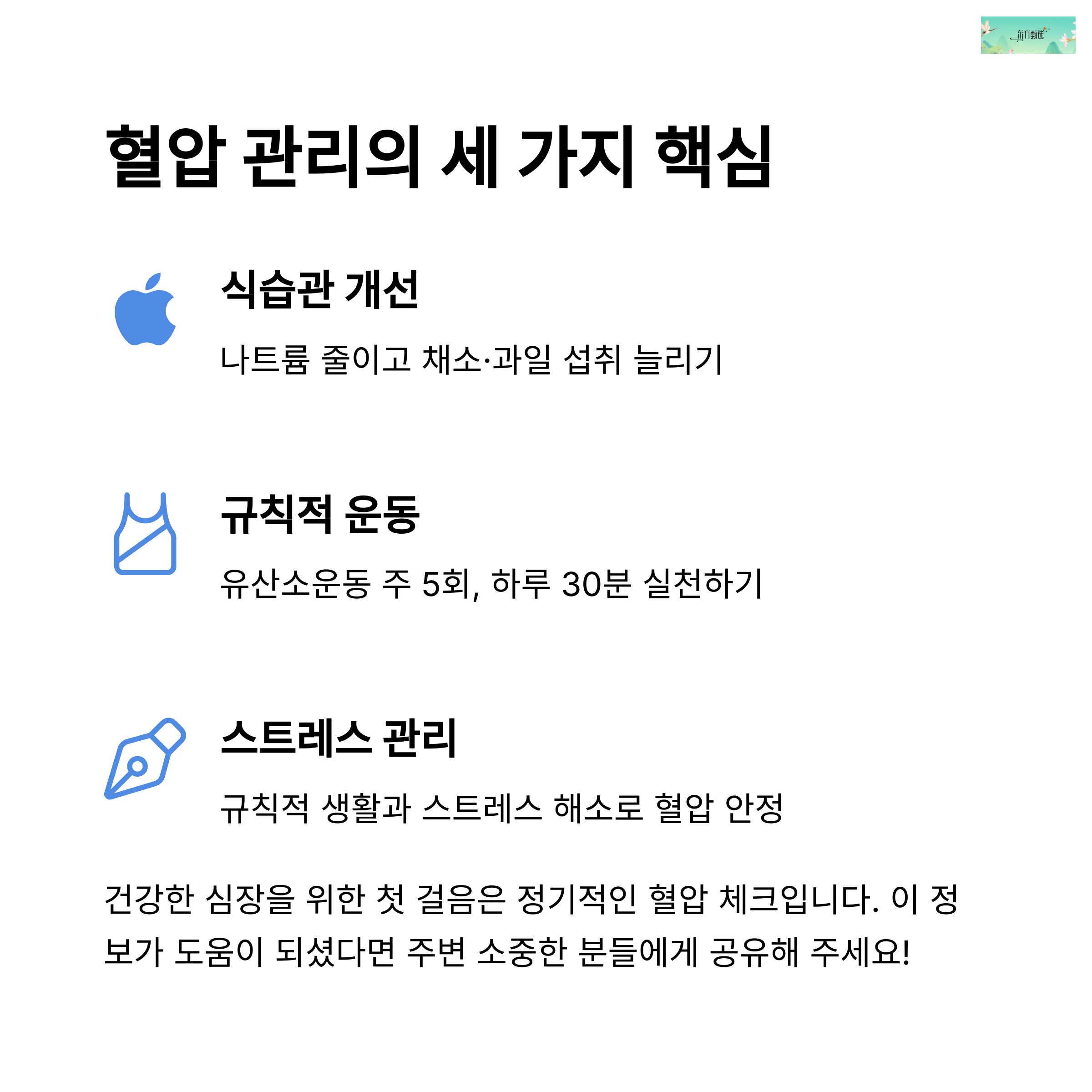 식이 조절, 꾸준한 운동, 충분한 수면, 스트레스 관리가 핵심입니다. 특히 저염식과 금연은 혈압 관리에 큰 도움이 됩니다.