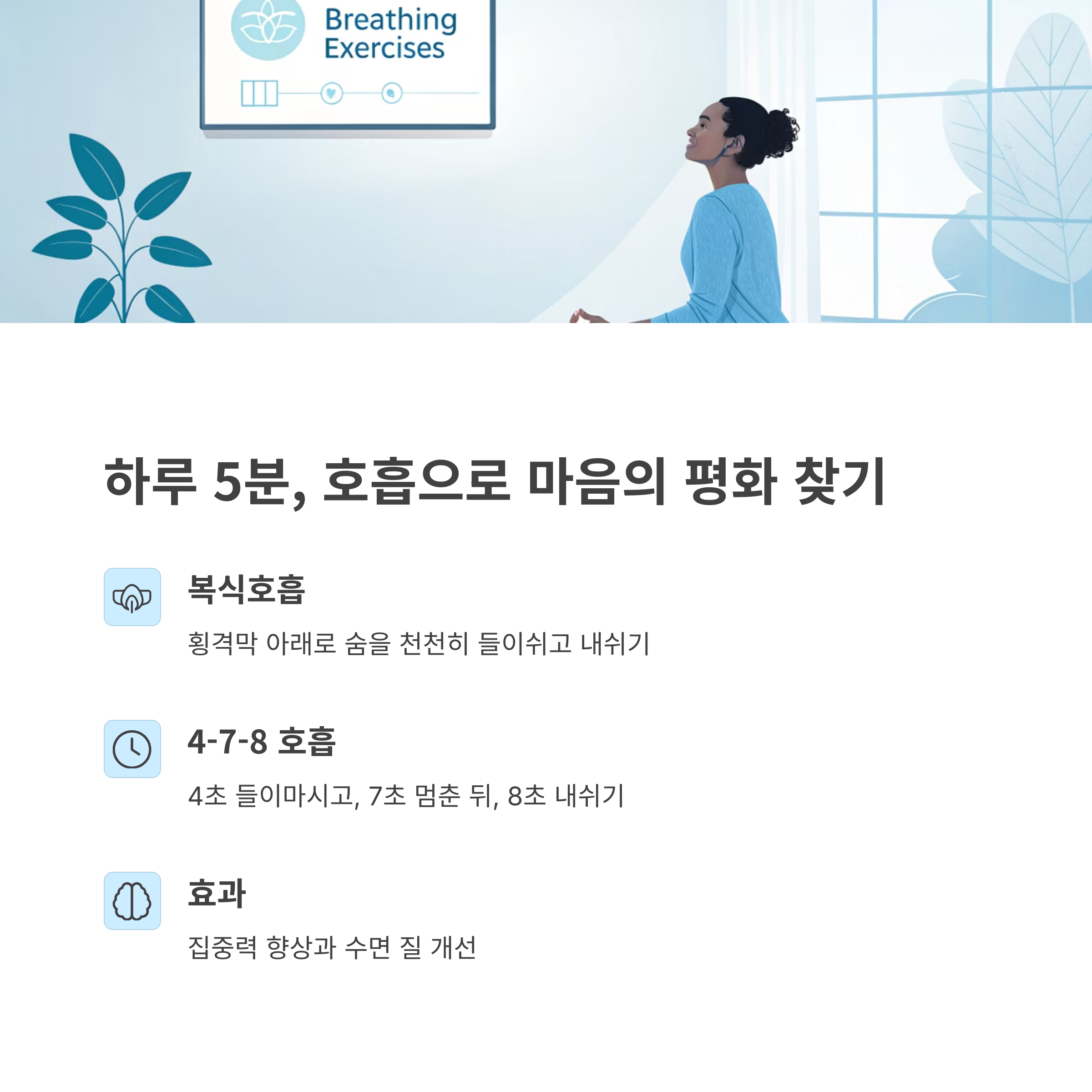 | 스트레스 완화, 수면 개선, 감정 안정 | 복식호흡, 4-7-8 호흡, 정지 호흡법 | 아침 기상 직후, 점심 후, 자기 전 |