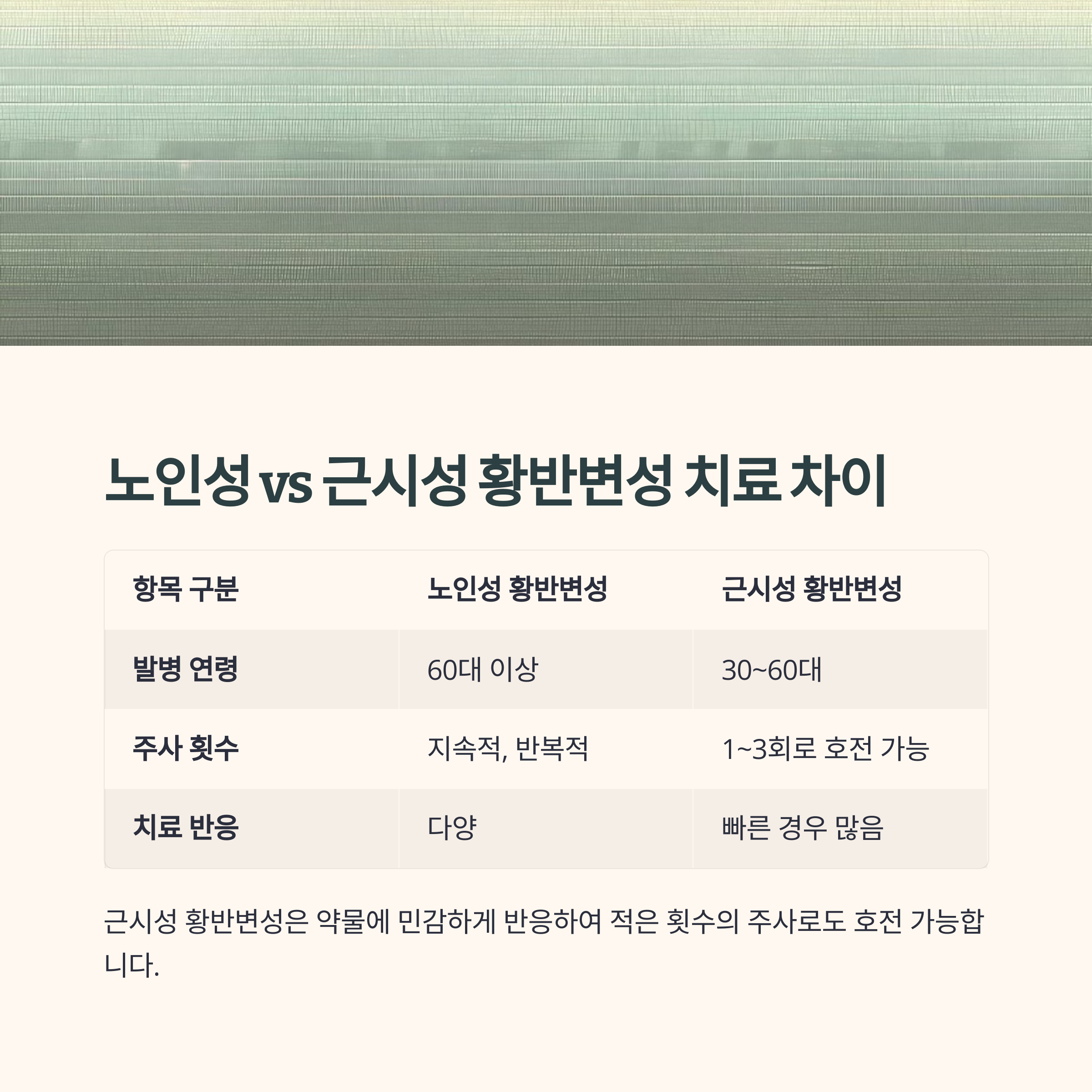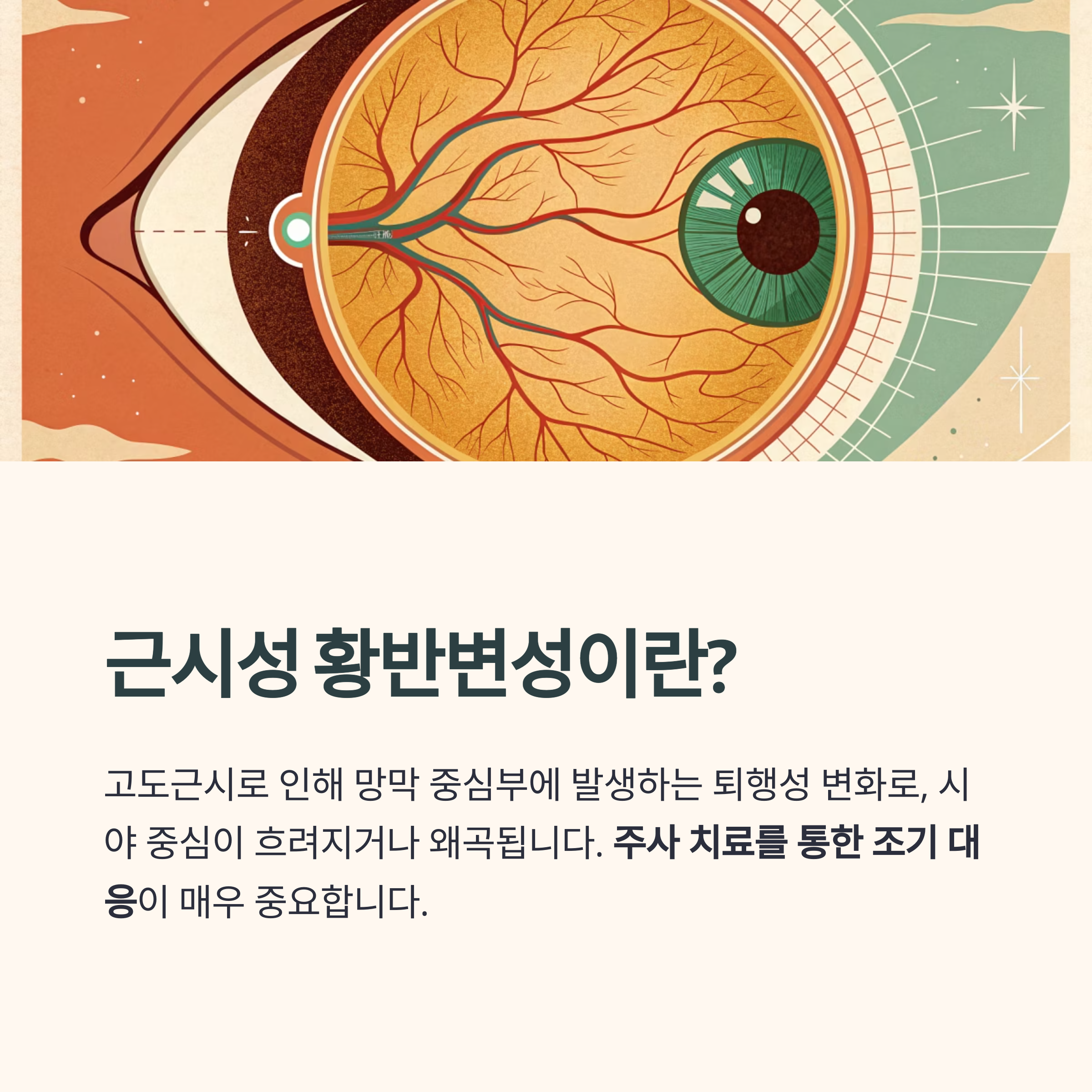 근시성 황반변성은 무서운 질환이지만, 정기적 검진과 조기 주사 치료로 충분히 관리 가능합니다.