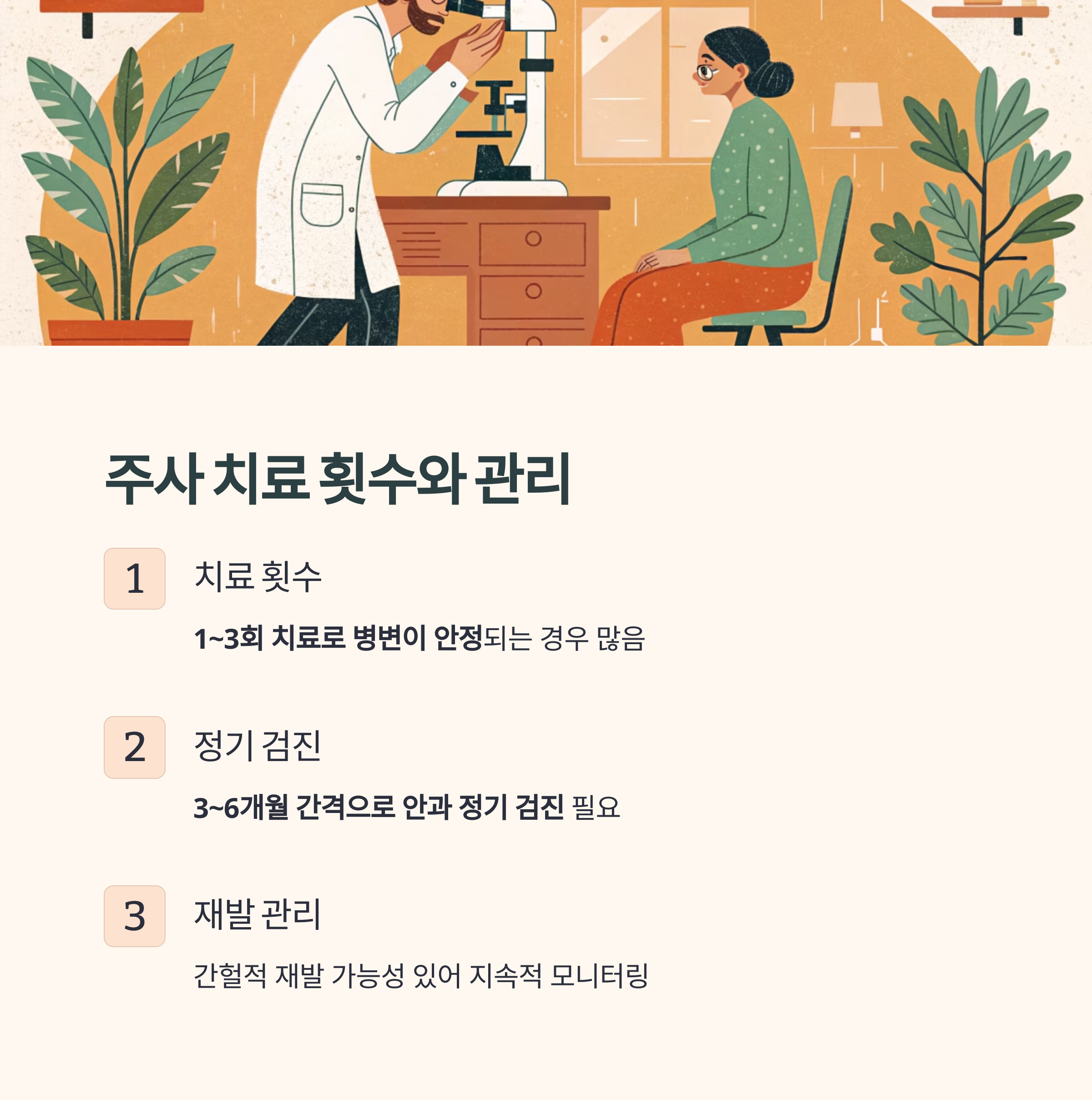 그러나 간헐적인 재발 가능성이 있으므로 3~6개월 간격으로 안과 정기 검진을 받는 것이 필요합니다.