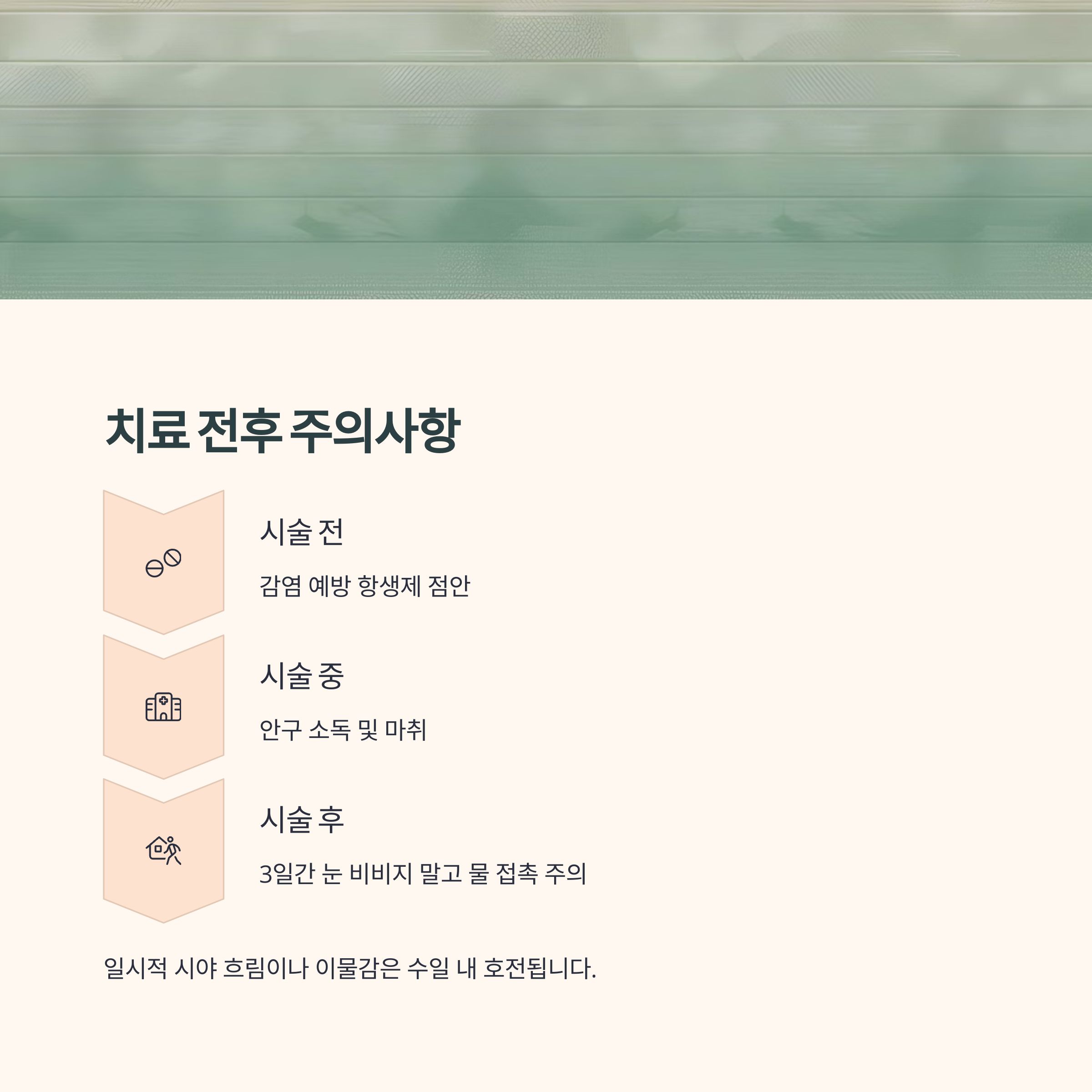 "치료 후 일시적 시야 흐림이나 이물감이 있을 수 있으나 대부분 수일 내 호전됩니다"는 설명처럼