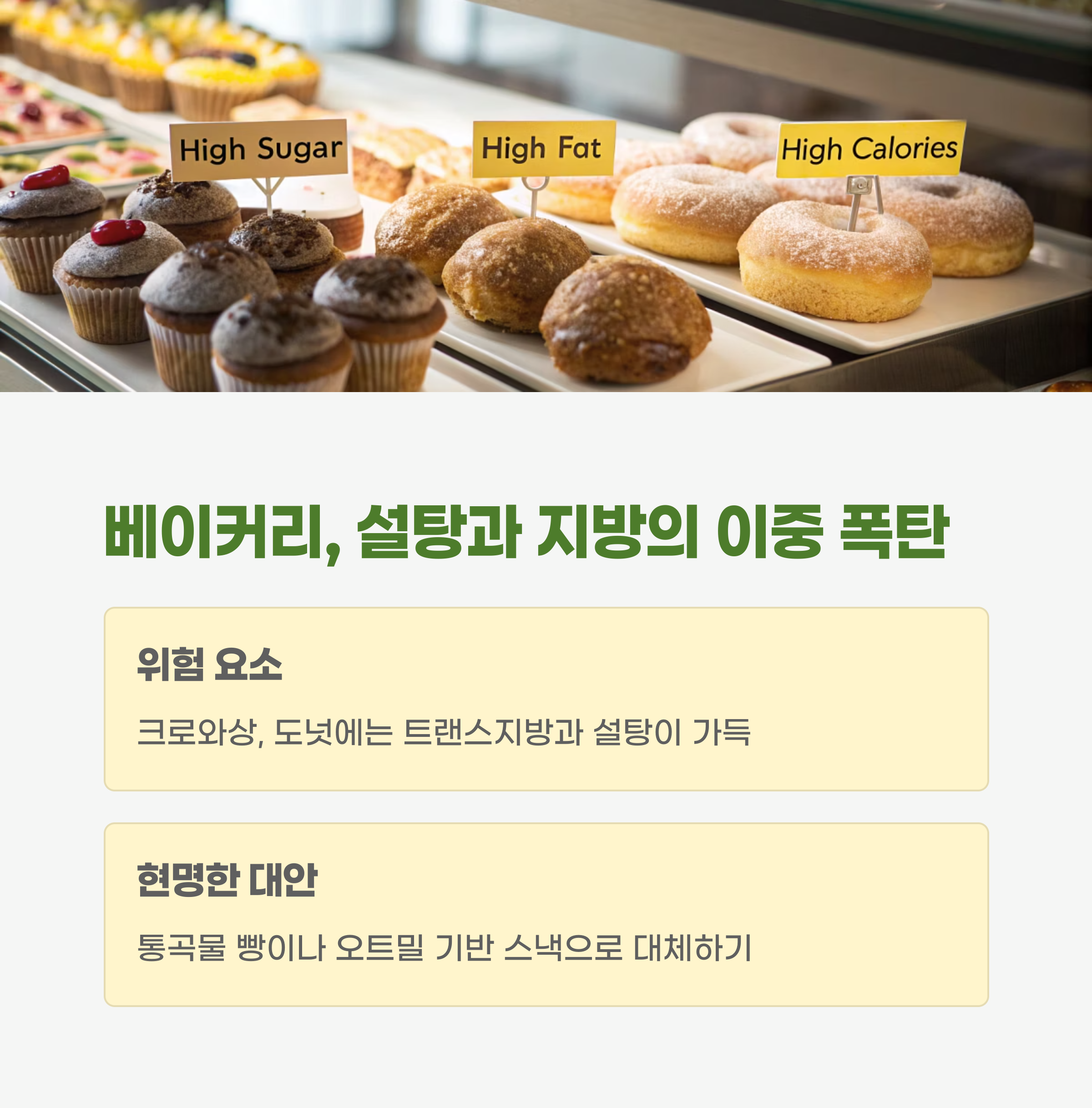 겉보기에 고급스럽지만, 대부분 마가린이나 쇼트닝으로 만들어지기 때문에 심혈관 질환 위험을 높입니다.