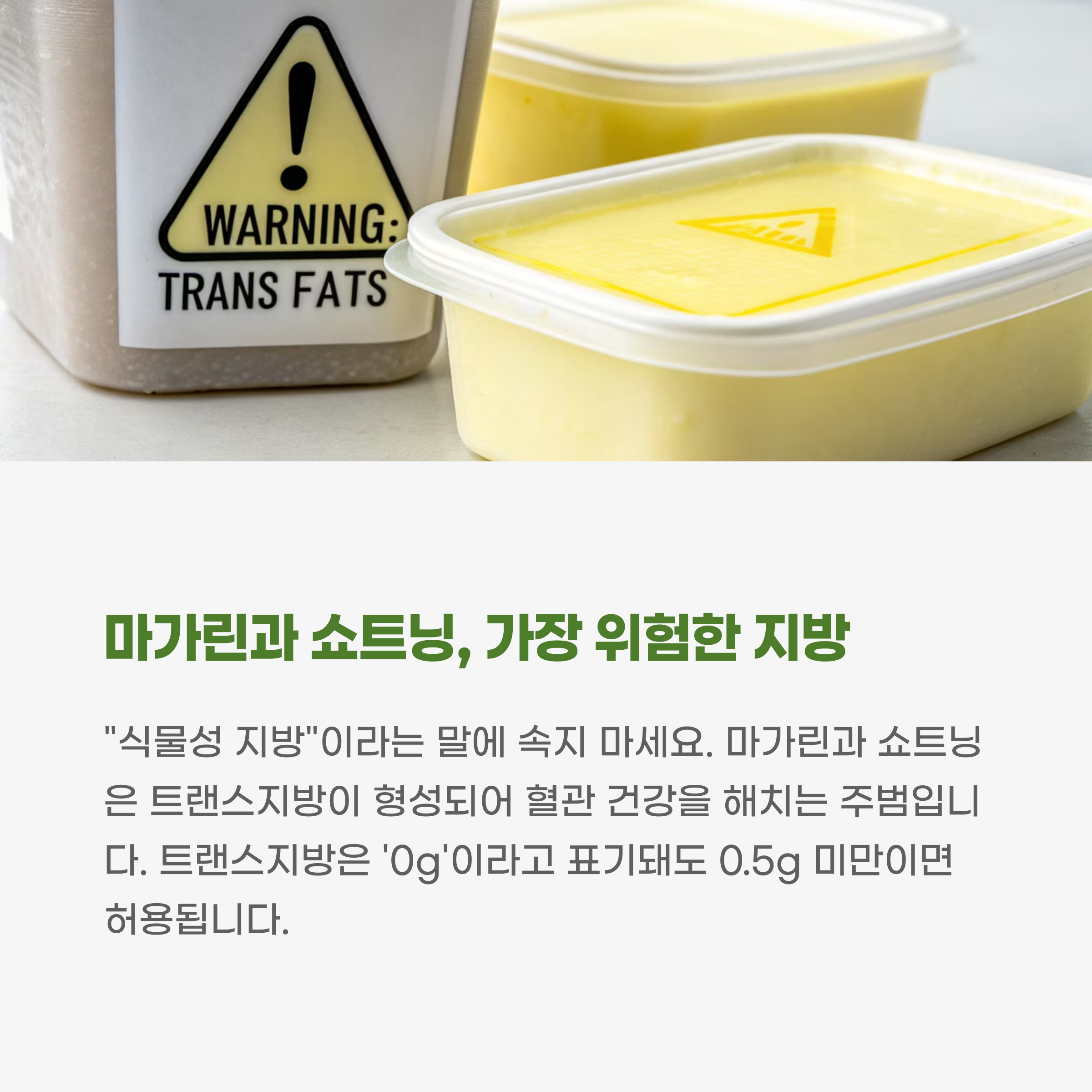 "트랜스지방은 '0g'이라고 표기돼도 0.5g 미만이면 허용되므로, 완전 배제하려면 직접 조리하는 습관이 필요합니다."