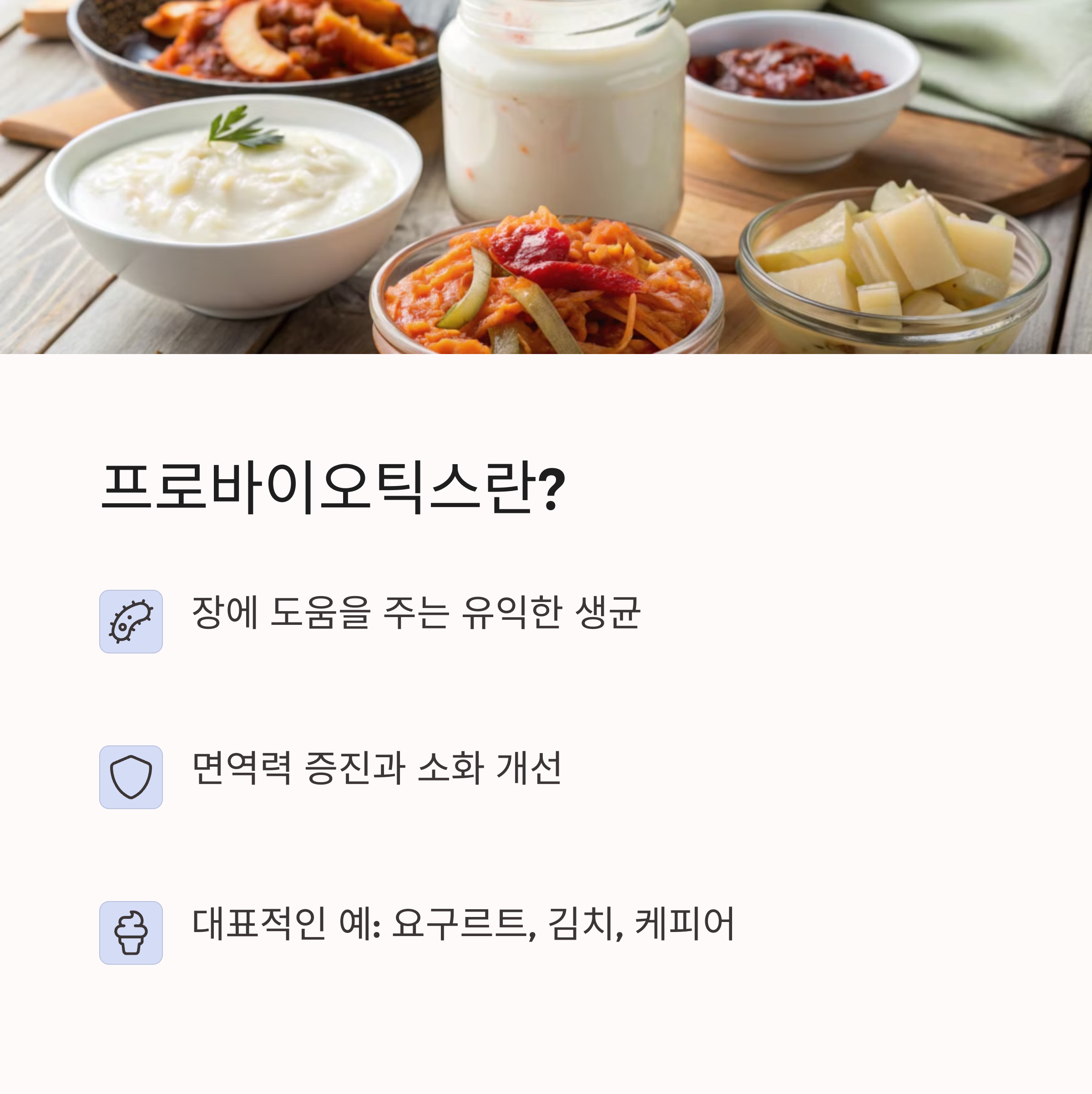 프로바이오틱스 장내 유익균 자체를 직접 보충하는 '살아 있는 미생물'입니다.