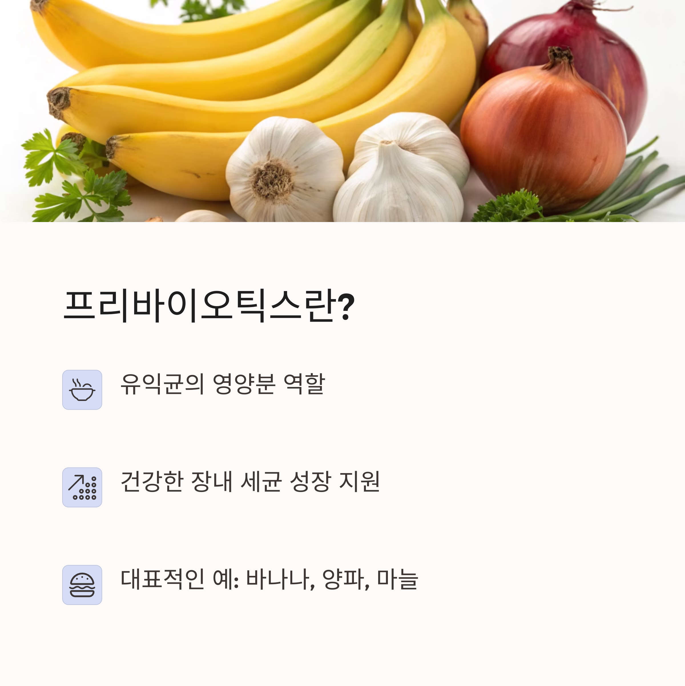 프리바이오틱스는 유산균의 먹이 역할을 하는 식이섬유 또는 난소화성 성분으로, 장내 유익균이 정착하고 번식하는 데 필수적인 환경을 만들어 줍니다. 프리바이오틱스는 주로 이눌린, 갈락토올리고당(GOS), 프락토올리고당(FOS) 등이 있으며, 바나나, 양파, 마늘, 귀리, 아스파라거스 등에 풍부합니다. 쉽게 말해, 프로바이오틱스가 군대라면 프리바이오틱스는 군대를 먹여 살리는 보급품인 셈입니다.