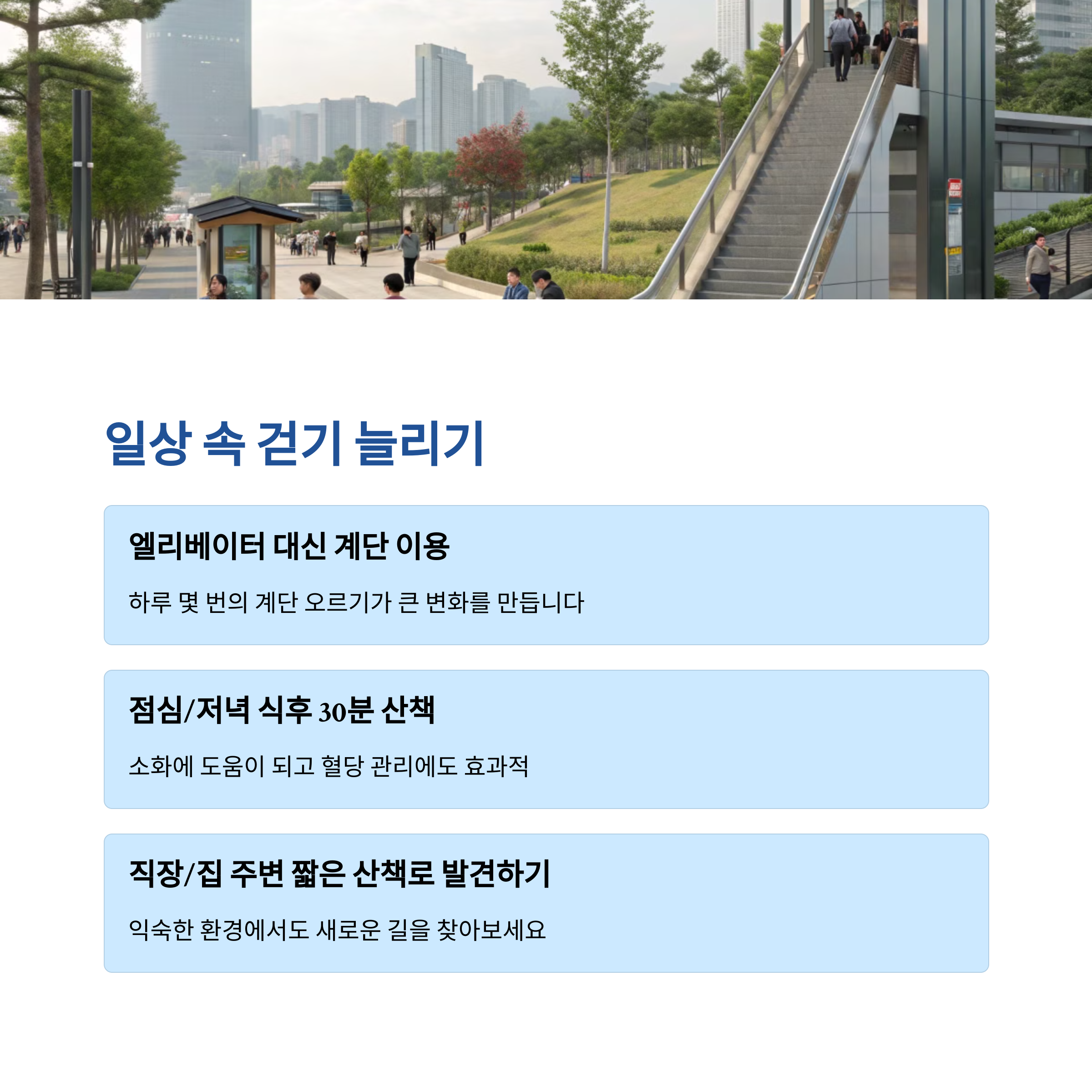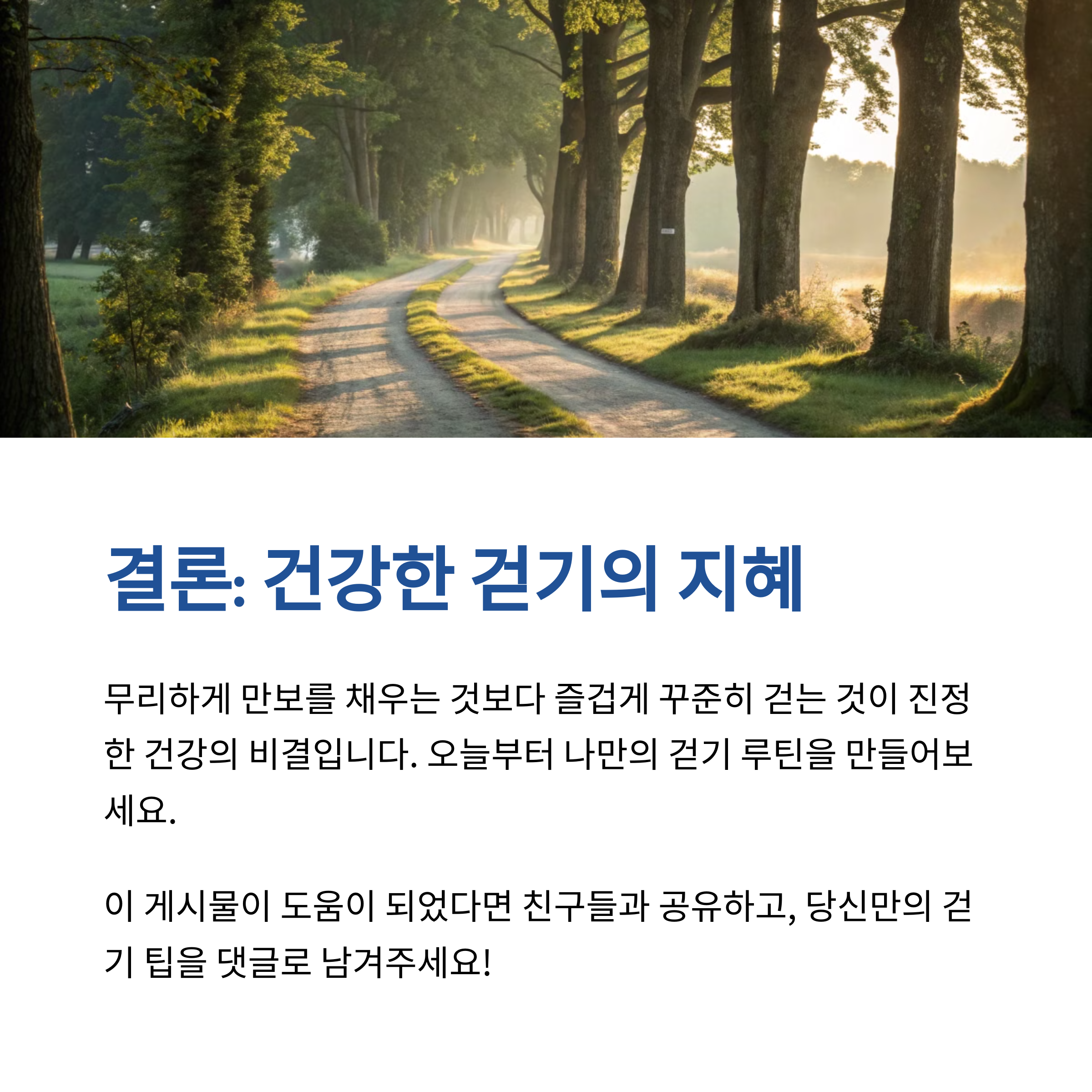 만보 걷기는 단순한 숫자가 아닌, 생활 속 활동량의 기준점으로 삼는 것이 좋습니다. 엘리베이터 대신 계단 이용, 한 정거장 미리 내려 걷기, 점심시간 산책 등 작은 걷기 습관들이 모이면 하루 만보는 물론, 건강한 삶으로 이어집니다. 중요한 건 '오늘도 몸을 움직였는가?'라는 질문에 자신 있게 YES라고 답할 수 있는 일상 속 움직임입니다.