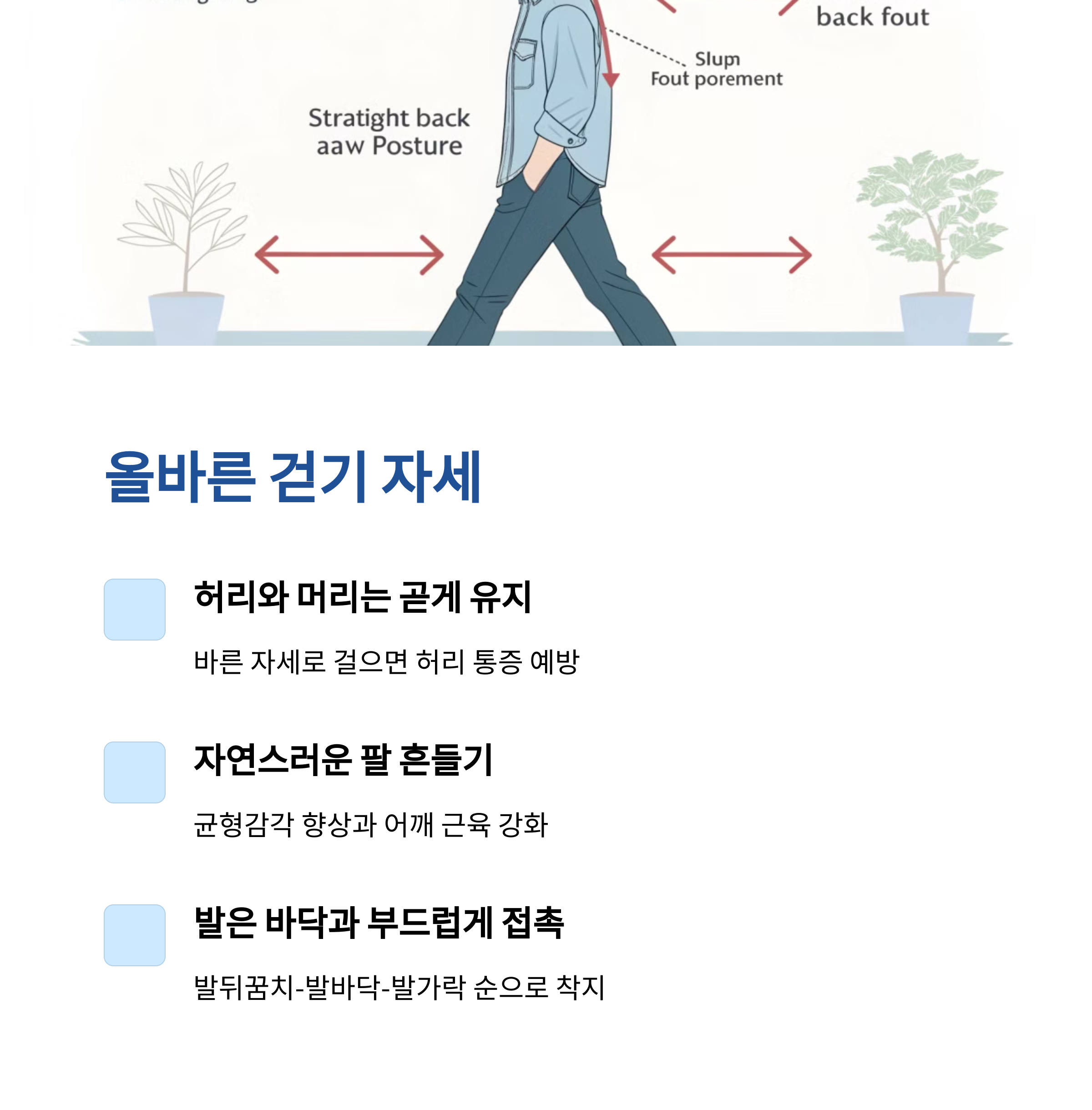 | 심폐 기능 강화, 체지방 감소, 스트레스 해소 | 시선 정면, 어깨 이완, 발뒤꿈치부터 착지 | 하루 3회 20분 걷기, 식후 산책, 계단 활용 |