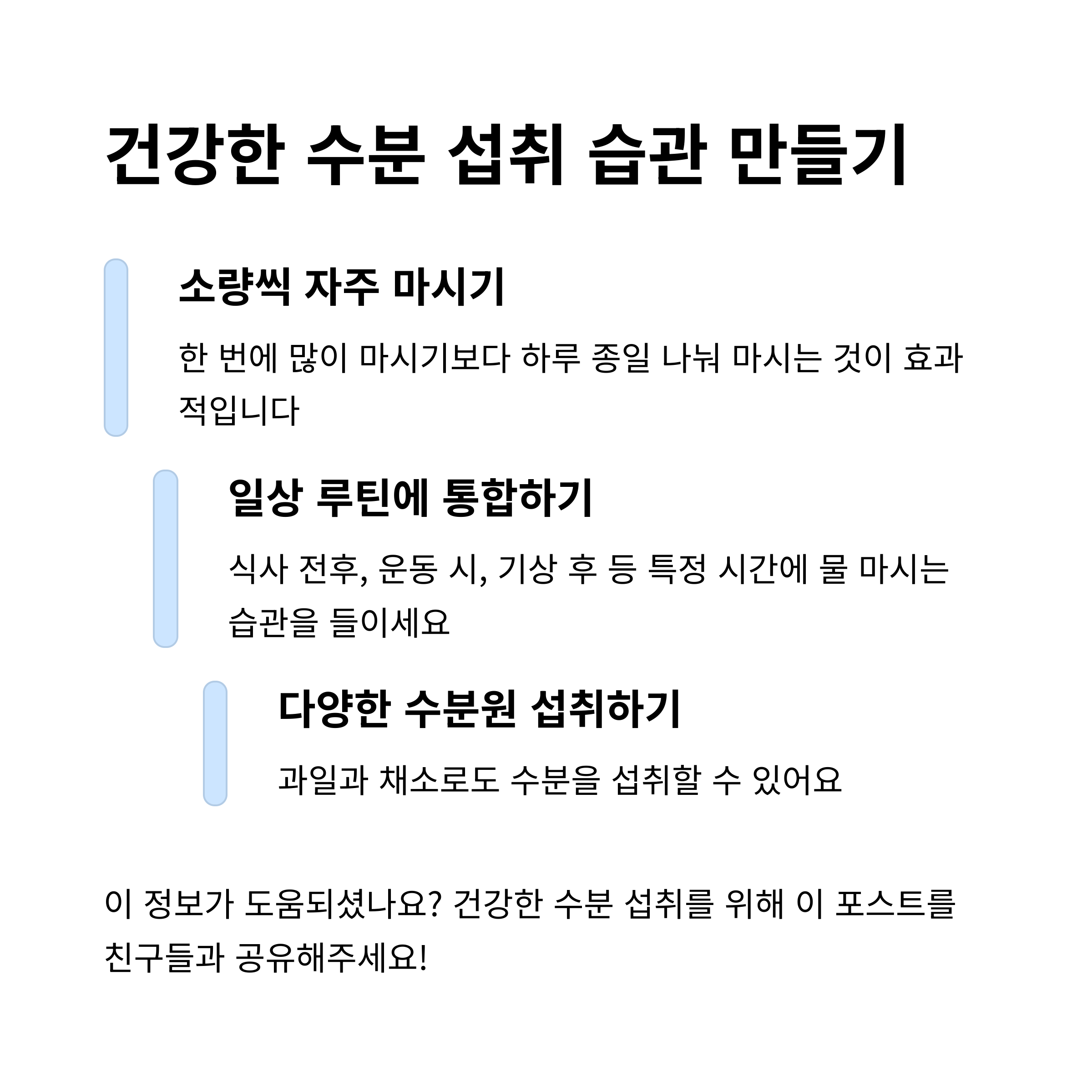 | 물만 마시면 충분할까? | 수분은 물 외에도 과일, 채소, 국, 차 등 다양한 식품으로 섭취되며, 총 수분 섭취량으로 계산됩니다. |