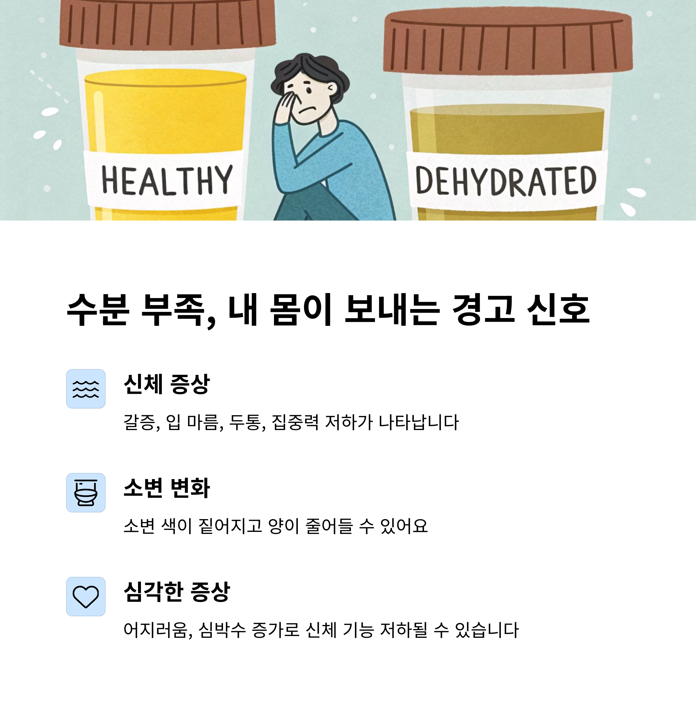 특히 갈증을 느낄 때는 이미 경미한 탈수 상태일 수 있으므로 규칙적으로 수분을 공급해주는 습관이 중요합니다.