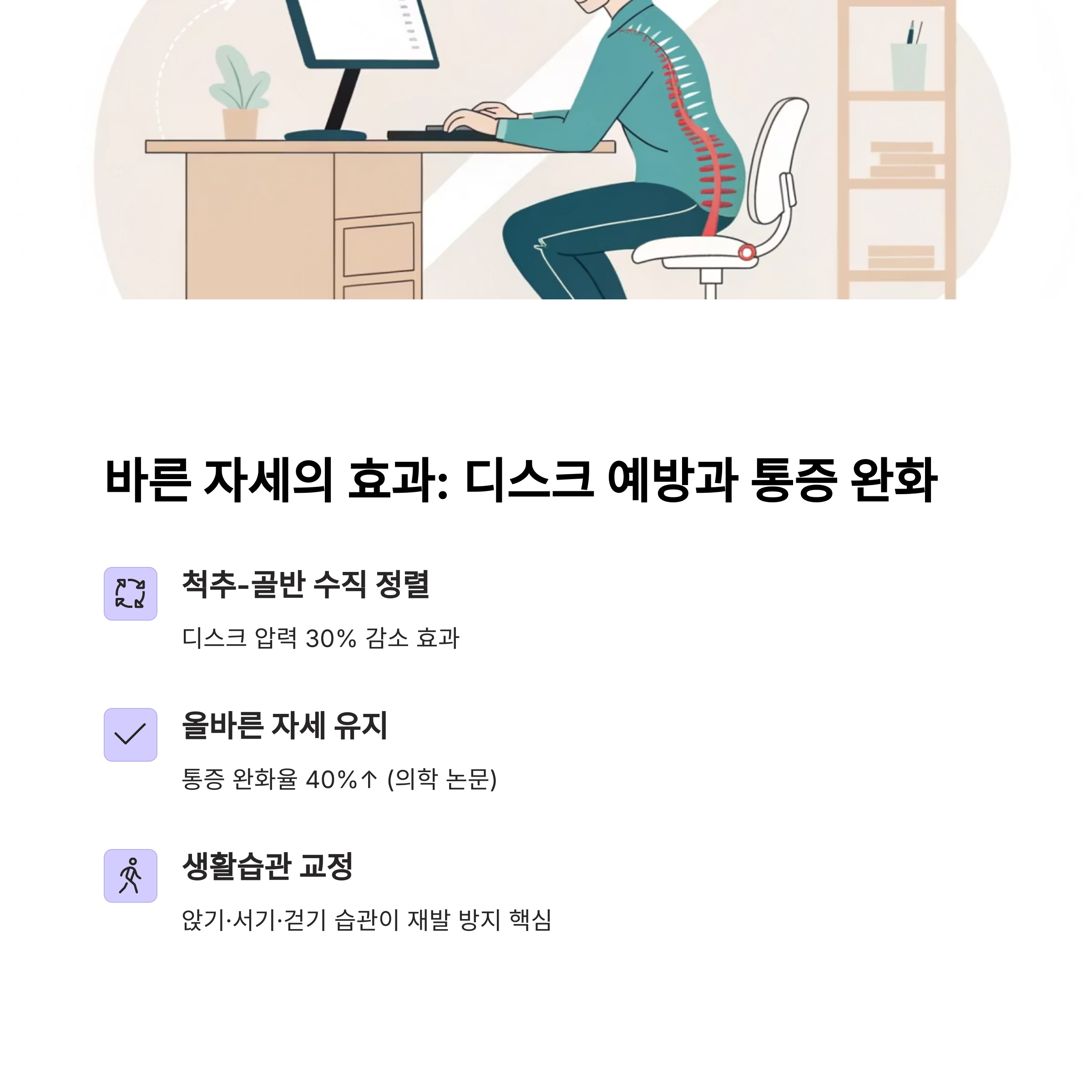| 구부정한 등, 다리 꼬기, 비스듬히 기대기 | 귀-어깨-엉덩이 수직, 골반 수직, 발바닥 바닥에 닿음 | 허리 쿠션, 1시간마다 스트레칭, 의식적인 자세 유지 |