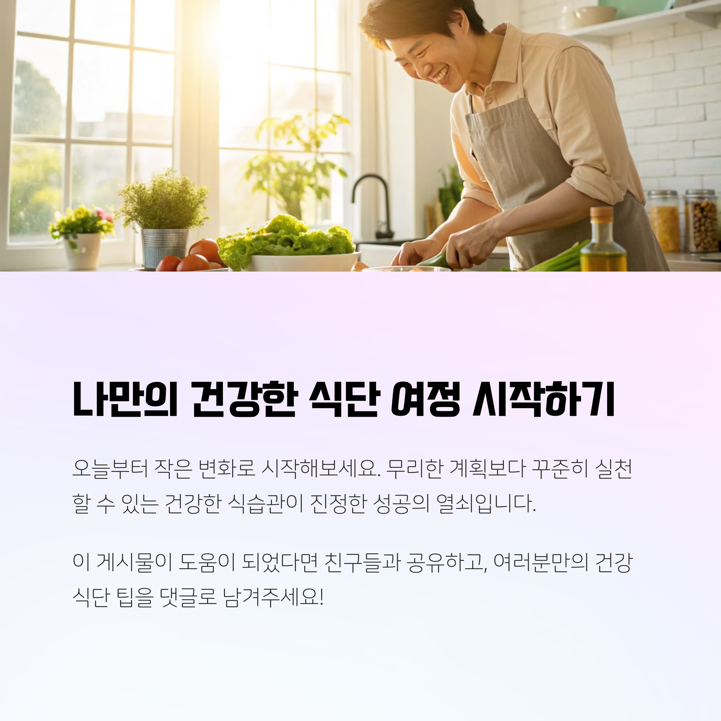 건강한 식단은 특별하거나 어려운 것이 아닙니다. 나의 하루 루틴 속에서 조금씩 개선해나가는 것, 그것이 진정한 변화의 시작입니다. 오늘 제시해드린 방식처럼 현실적인 기준을 가지고 실천 가능한 식단을 구성해보세요. 완벽을 추구하기보다는 꾸준함이 더 중요하며, 그렇게 길게 이어갈 수 있는 식단이 결국 여러분의 몸과 마음을 변화시켜줄 것입니다. 먹는 것 하나만 바뀌어도 삶 전체의 활력이 달라질 수 있다는 사실, 지금 이 순간부터 실감하시게 되길 바랍니다.