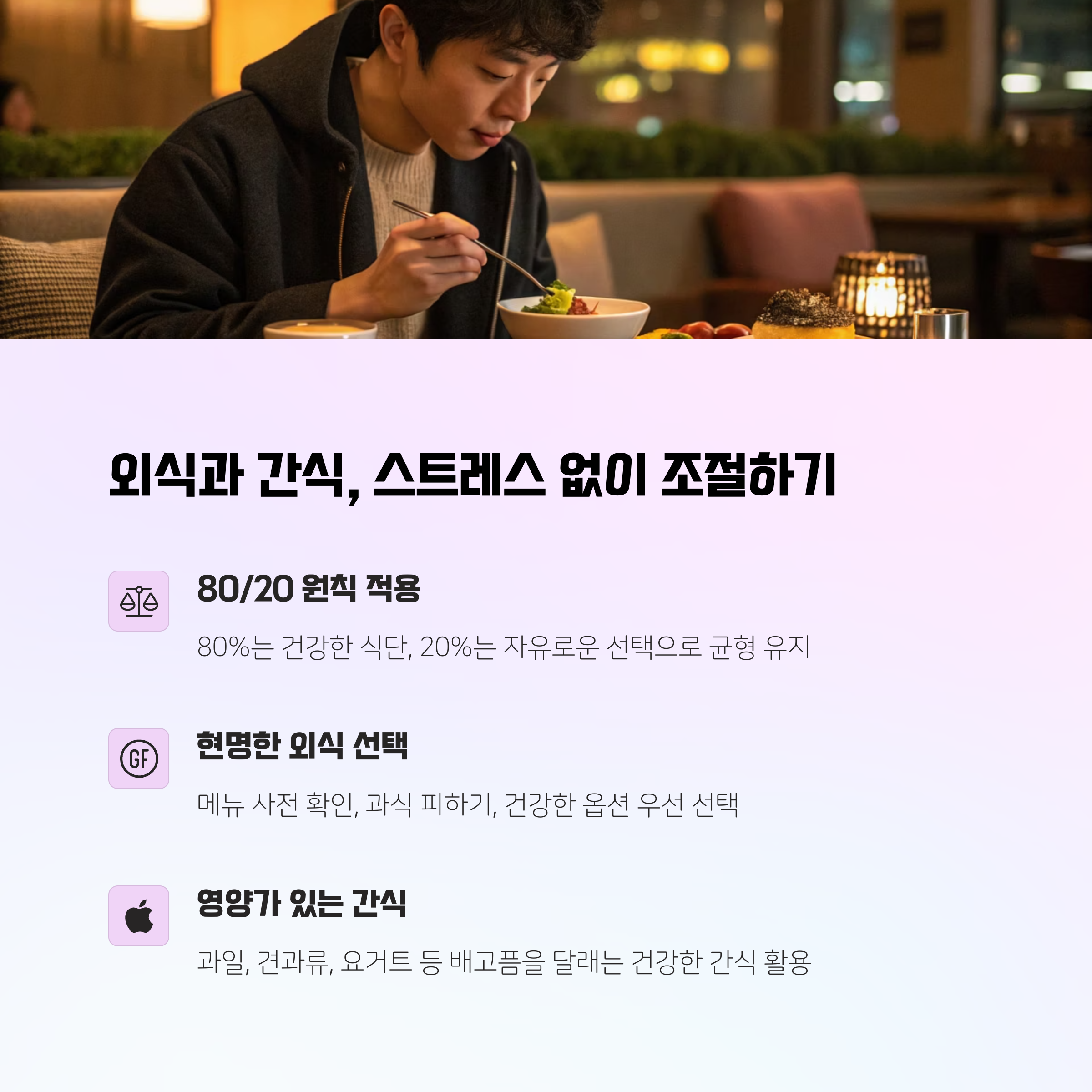 | 현실적인 시간과 식사 습관 고려 | 단백질, 탄수화물, 지방 고르게 배치 | 유연하게 조절하고 지속성 높이기 |