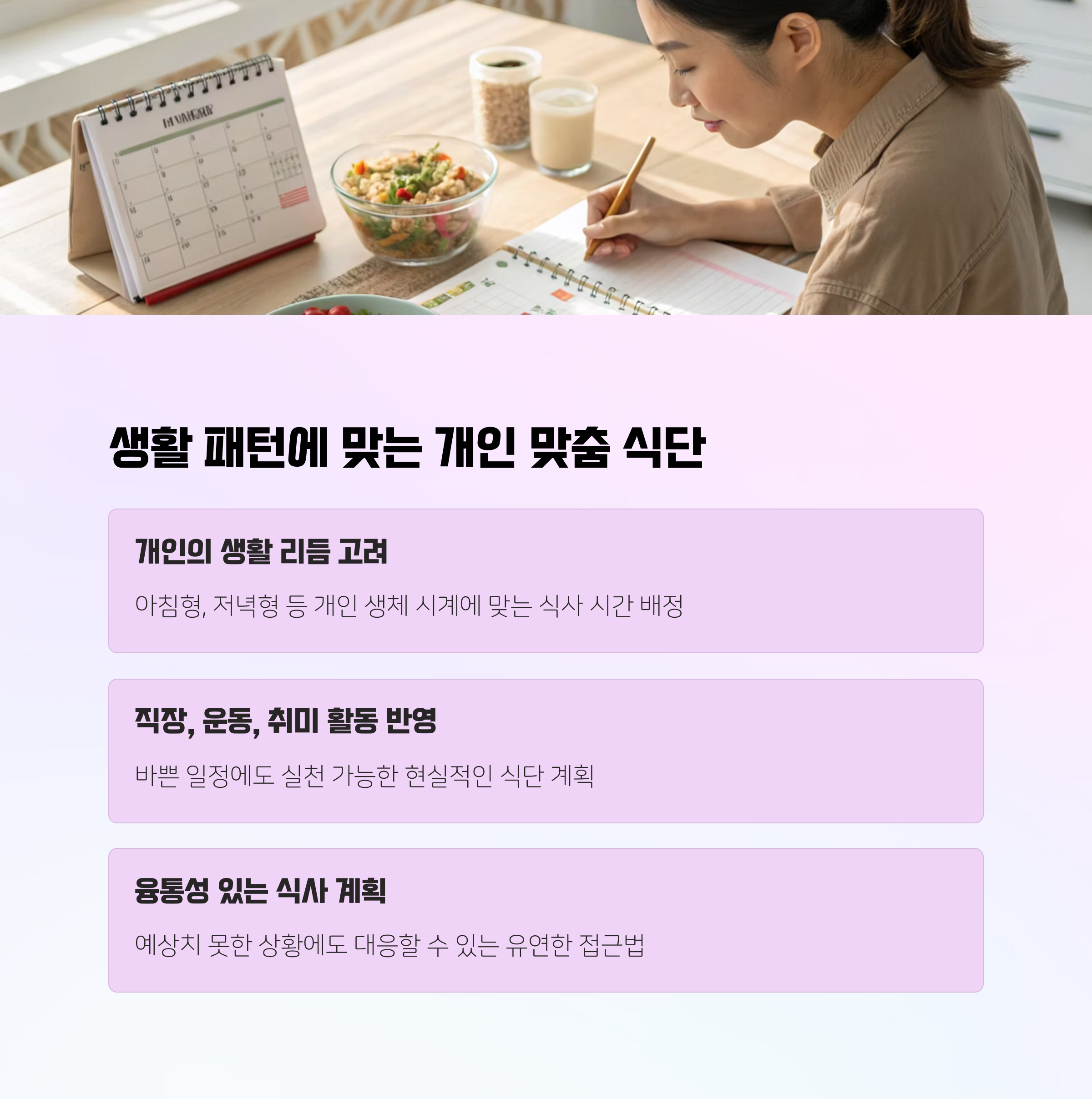 | 건강한 루틴 만들기 | 내 생활 패턴에 맞춘 식단이 오랫동안 유지돼요 |