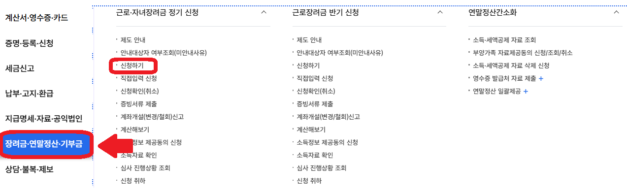 > 인증 및 로그인 후, 오른쪽 상단의 1. 전체메뉴 클릭 2. 왼쪽 바의 장려금/연말정산/기부금 클릭 후 신청하기.