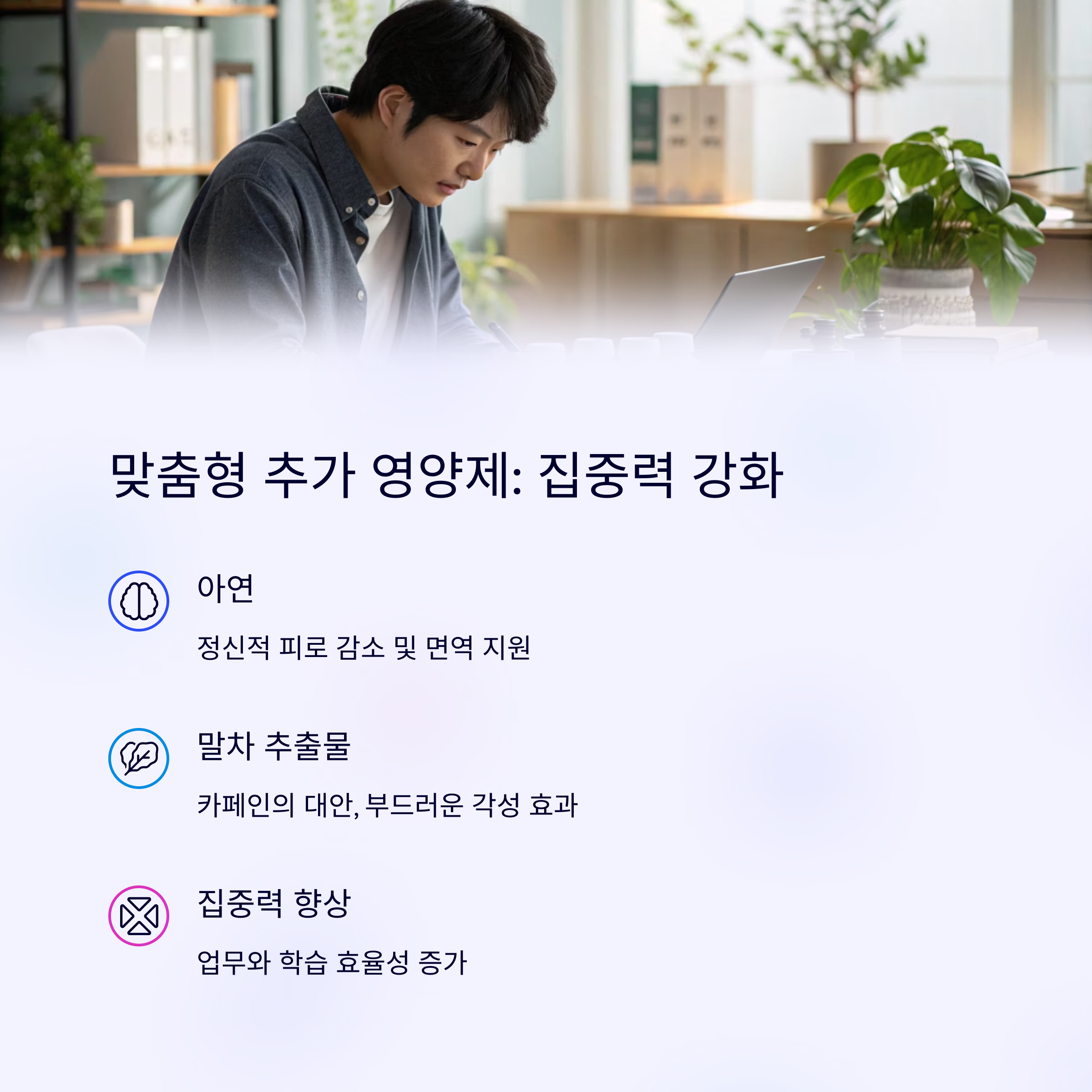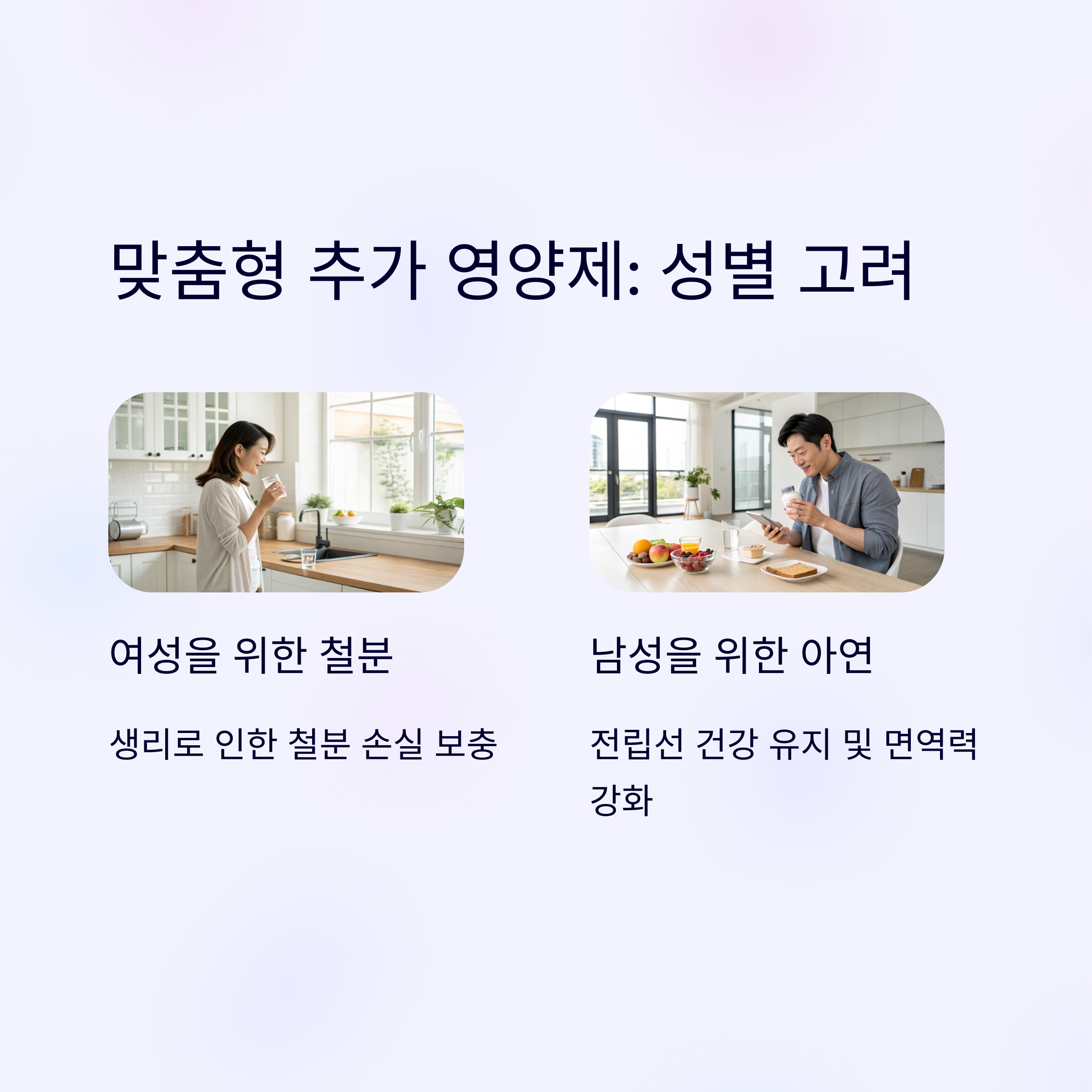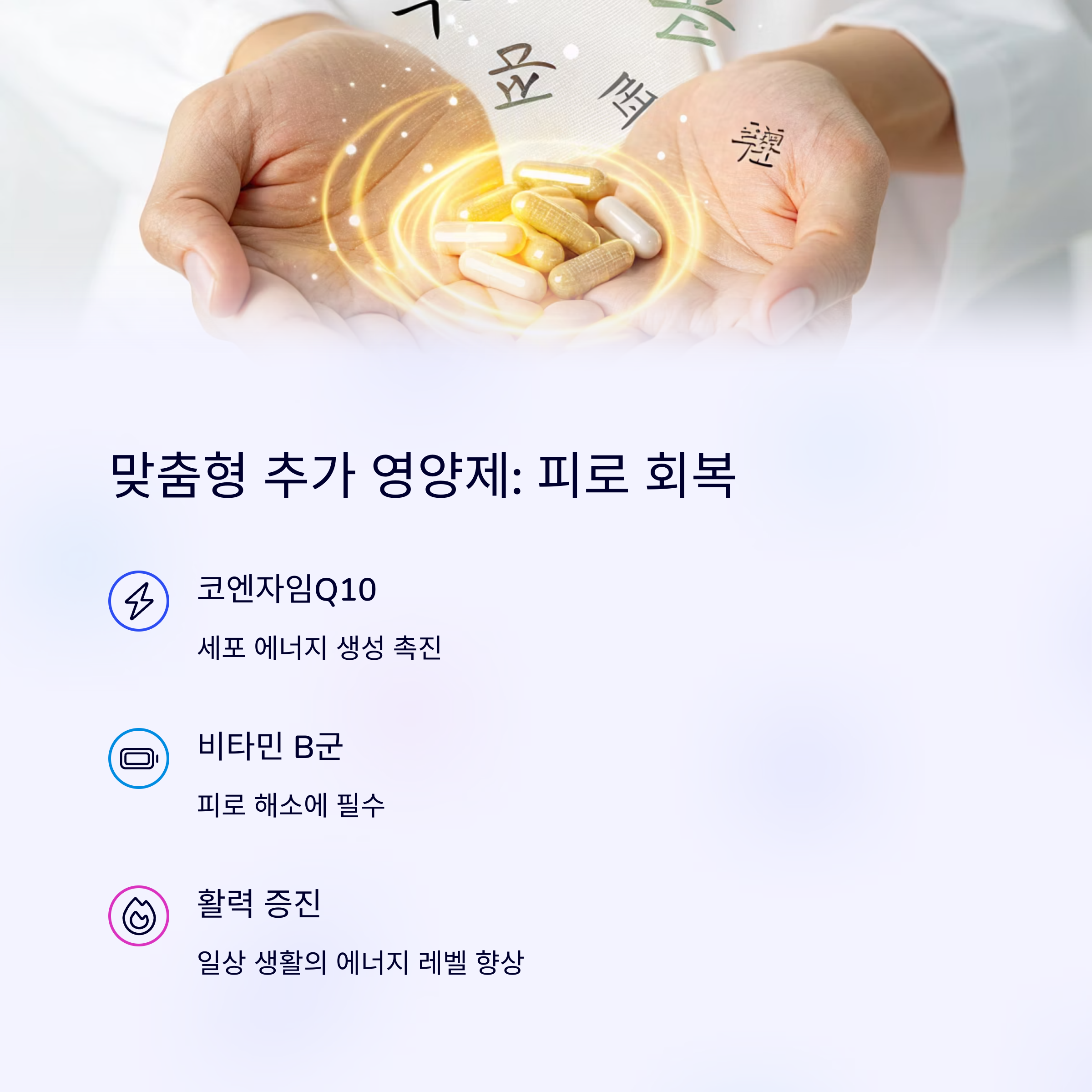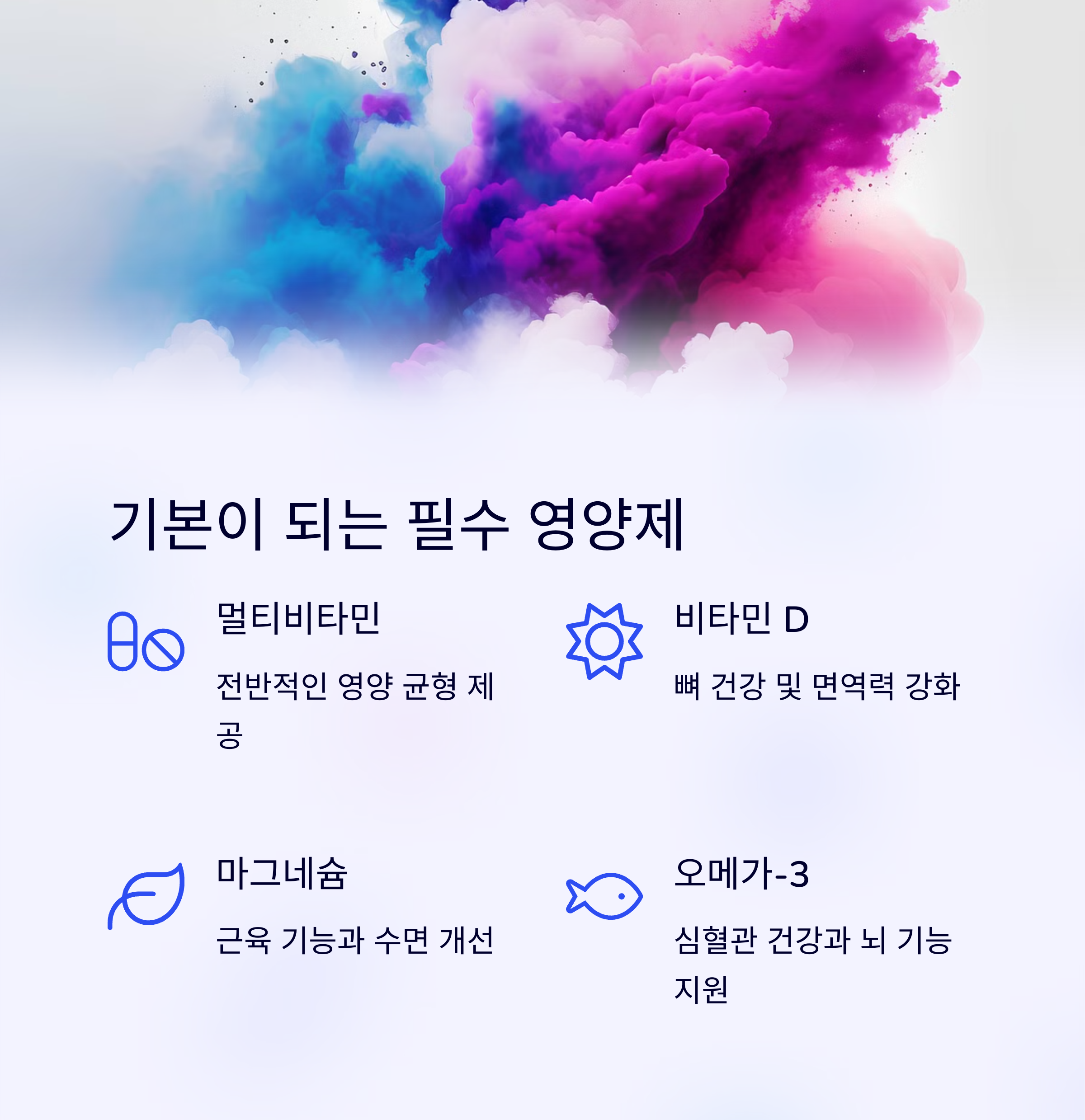 | 멀티비타민, 비타민D, 마그네슘, 오메가3 | 피로: 테아닌, 활력: 아연·코큐텐, 여성: 철분·엽산 | 식후 복용, 중복 성분 확인, 꾸준함 유지 |