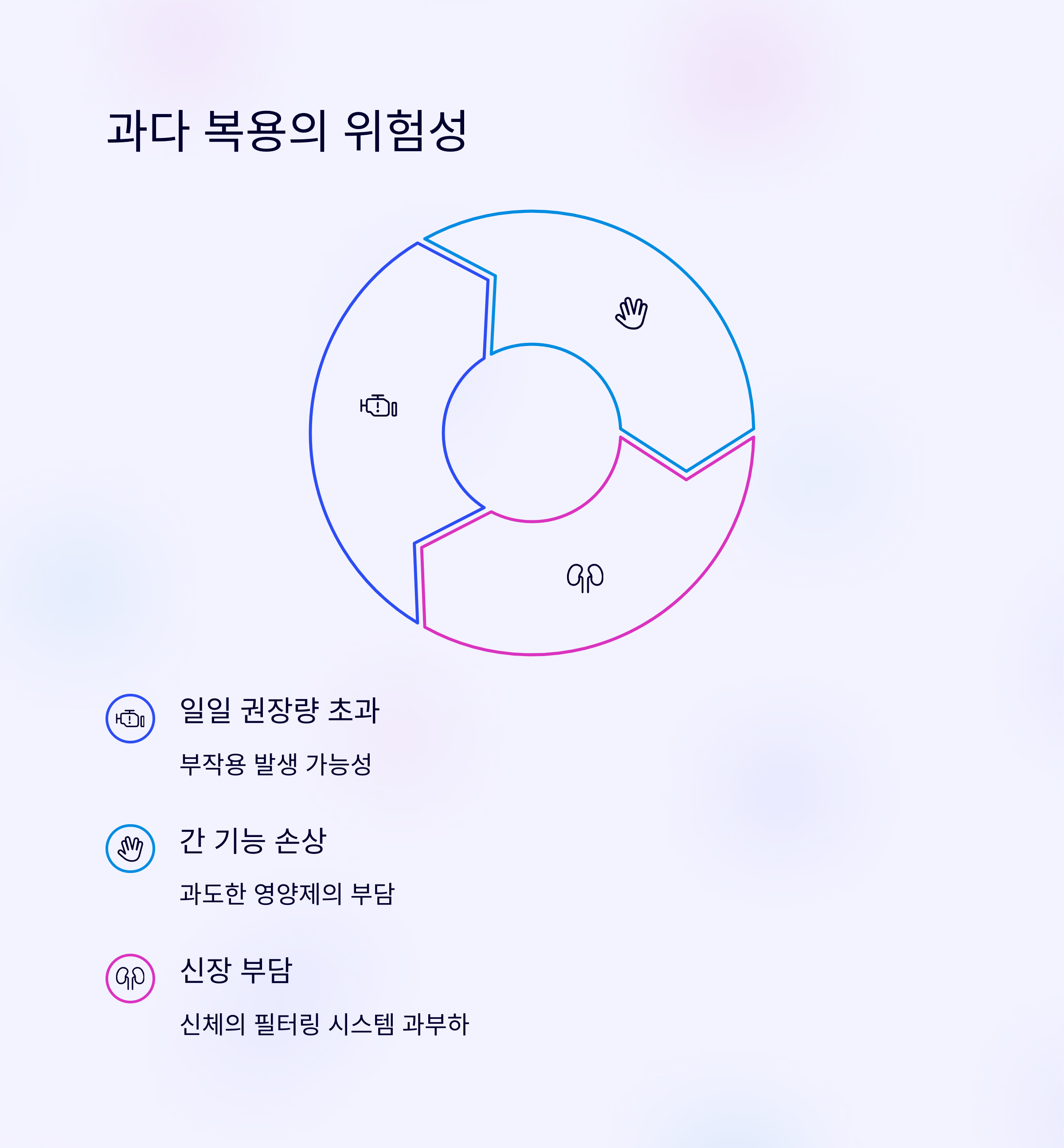 권장량 이상으로 과다 섭취하면 간·신장에 부담이 되거나 체내 흡수율이 떨어질 수 있습니다. 필요한 것만 최소 용량으로 조합하는 것이 가장 안전하고 효과적입니다.