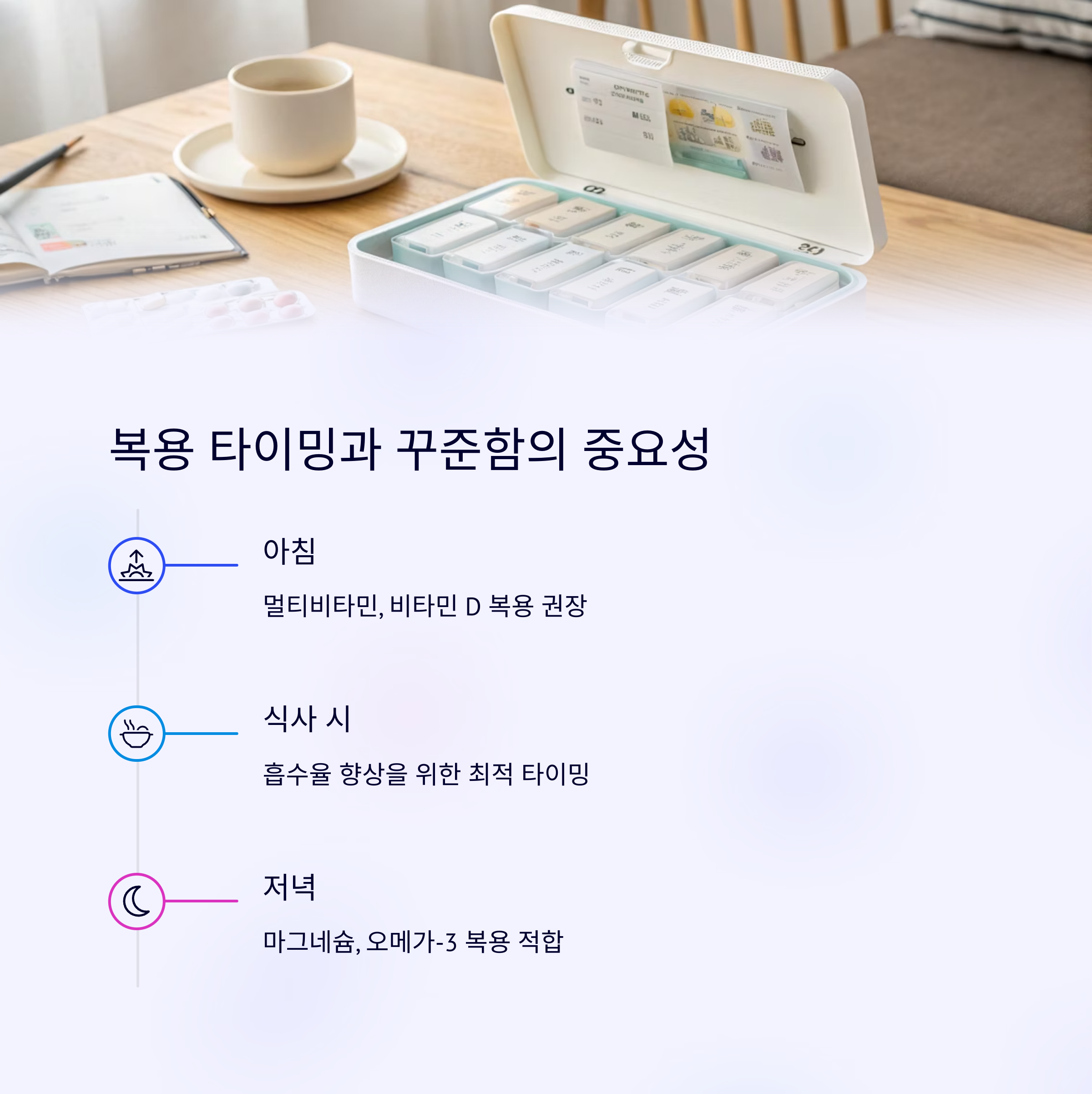 | 멀티비타민, 비타민D, 마그네슘, 오메가3 | 피로: 테아닌, 활력: 아연·코큐텐, 여성: 철분·엽산 | 식후 복용, 중복 성분 확인, 꾸준함 유지 |
